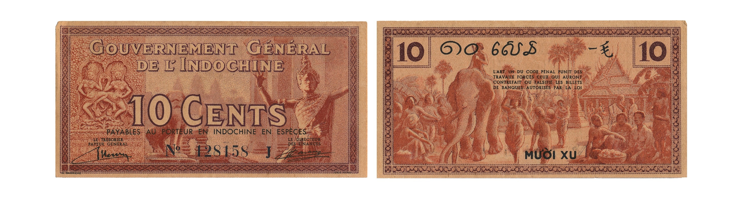 Tiền giấy 10 cents (Mười xu): Hình chữ nhật, kích thước 106 x 54 mm, màu nâu và đỏ nâu, phát hành toàn Đông Dương. Mặt trước in mệnh giá “10 cents” hình ảnh tượng vũ nữ Apsara với đền Angkor. Mặt sau in hình ảnh lễ hội trước cổng chùa. Loại 10 cents có 2 loại: loại khôngcó mệnh giá bằng chữ Lào và loại có đầy đủ cả mệnh giá bằng chữ Việt Nam, chữ Campuchia, chữ Lào và chữ Hán.