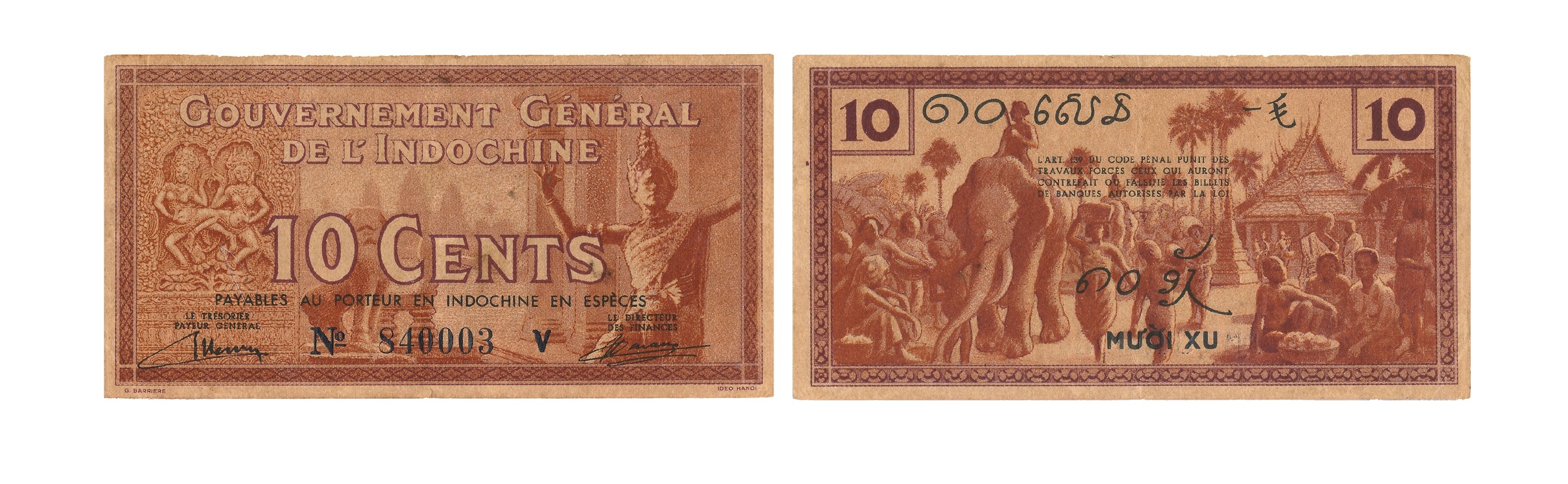 Tiền giấy 10 cents, 1940 (In mệnh giá bằng chữ Việt Nam, chữ Campuchia và chữ Hán)