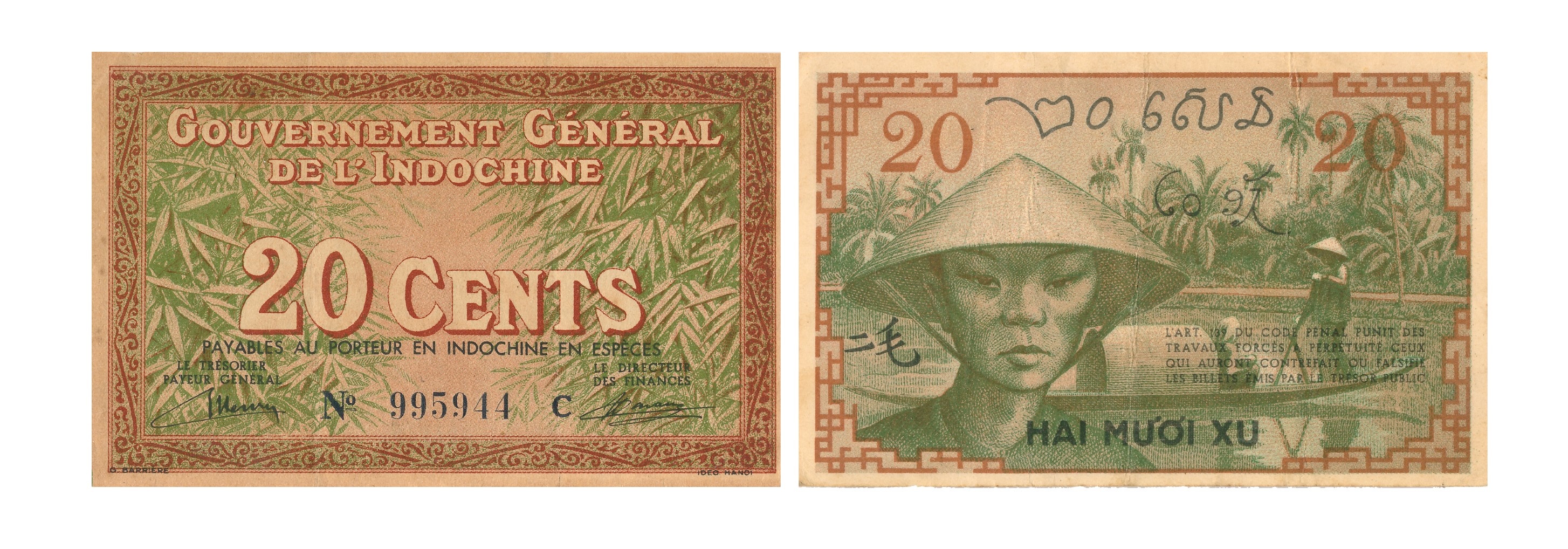 Tiền giấy 20 cents (Hai mươi xu): Hình chữ nhật, kích thước: 105 x 65 mm, màu xanh lá cây và nâu đỏ, nơi phát hành toàn Đông Dương. Mặt trước in mệnh giá “20 cents” trên lá trúc. Mặt sau in hình ảnh thôn nữ Nam Bộ và sông nước miền Nam, mệnh giá bằng chữ Việt Nam, chữ Campuchia, chữ Lào và chữ Hán.