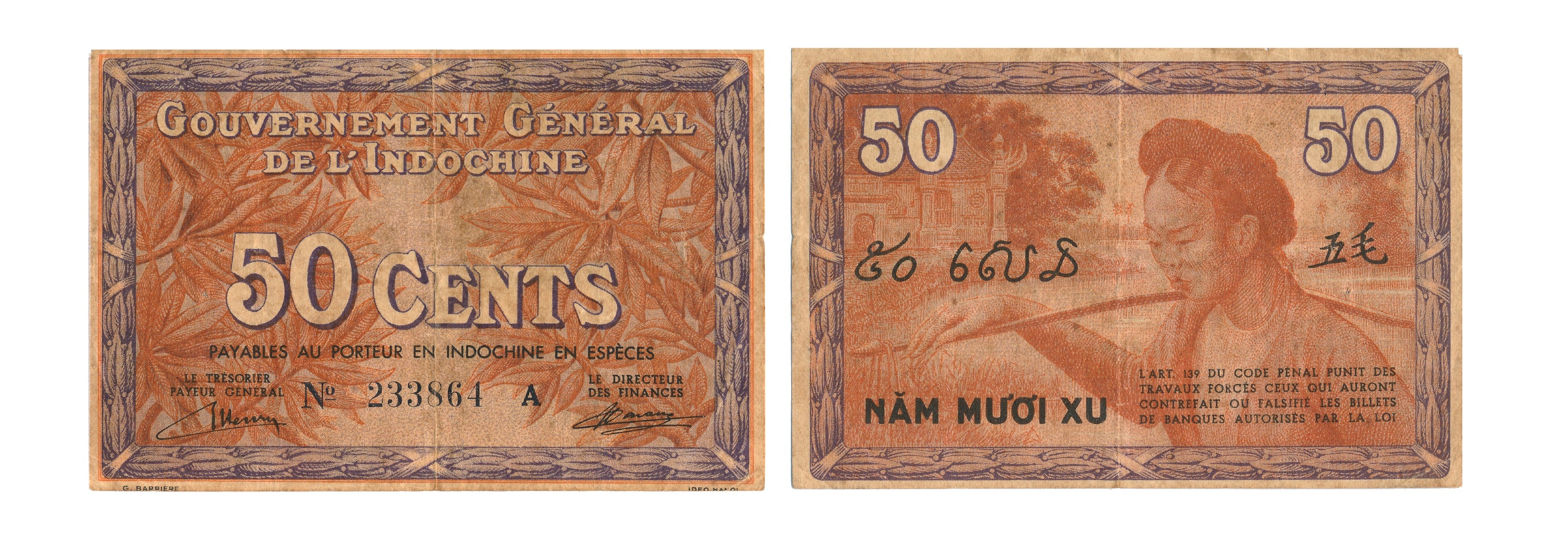 Tiền giấy 50 cents (Năm mươi xu): Hình chữ nhật, kích thước 105 x 70 mm, màu nâu đỏ và tím, nơi phát hành toàn Đông Dương. Mặt trước in mệnh giá “50 cents” trên lá chăm pa. Mặt sau in hình ảnh thôn nữ Bắc Kỳ gánh nước bên giếng làng và mệnh giá bằng chữ Việt Nam, chữ Campuchia, chữ Lào và chữ Hán.