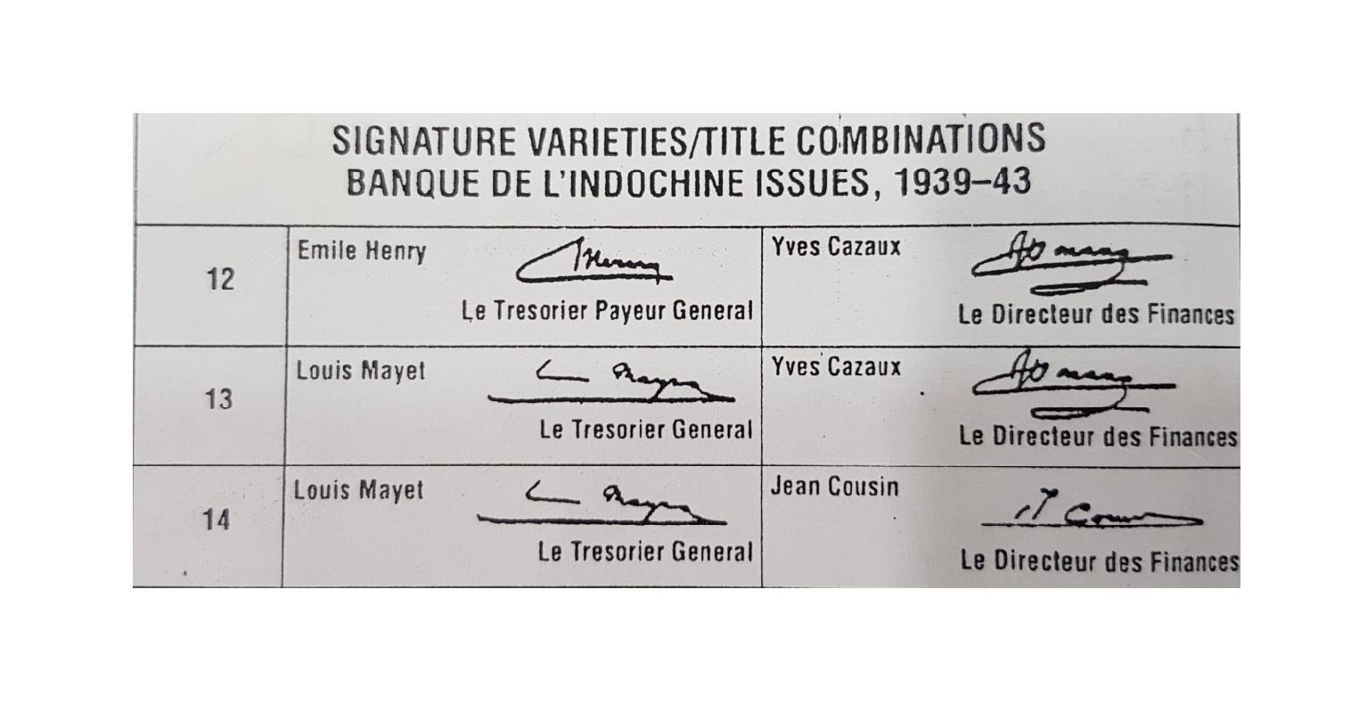 Ngân hàng Đông Dương phát hành các mệnh giá: 10 cents, 20 cents và 50 cents. Tiền kỳ này có đặc trưng là có chữ ký Le Trésorier Payeur General: Émile HENRY góc dưới bên trái tờ tiền và Le Derecteur des Finances: Yves CAZAUX góc dưới bên phải tờ tiền.