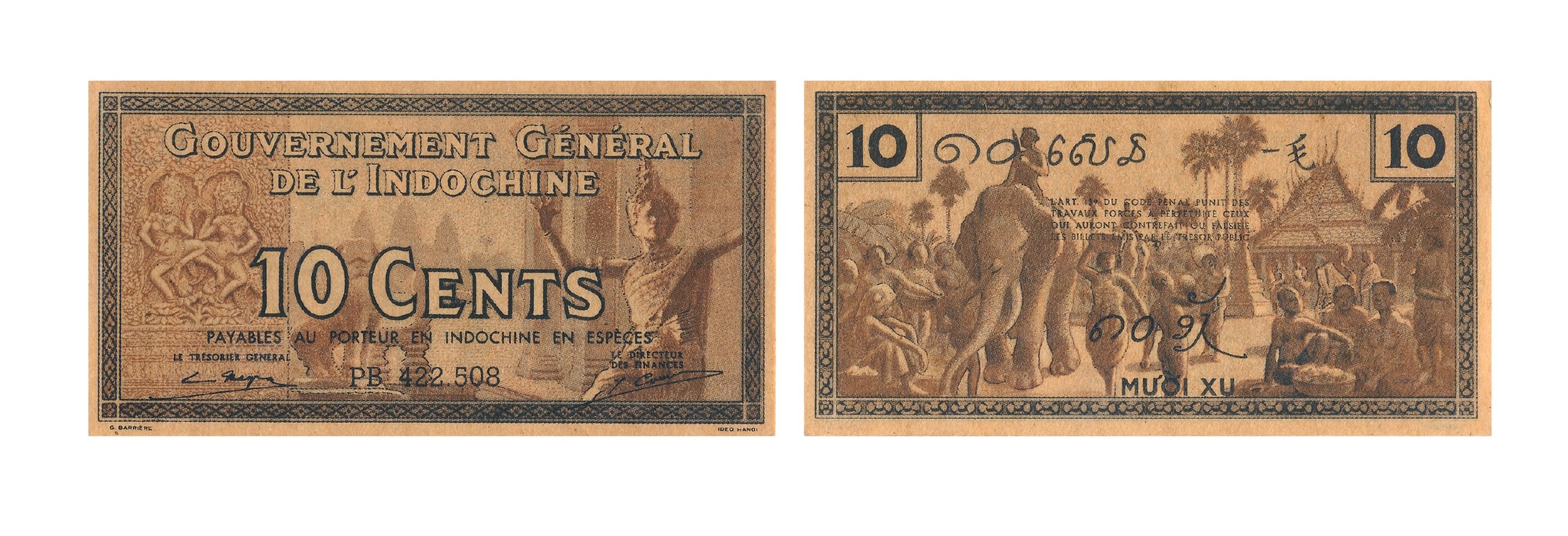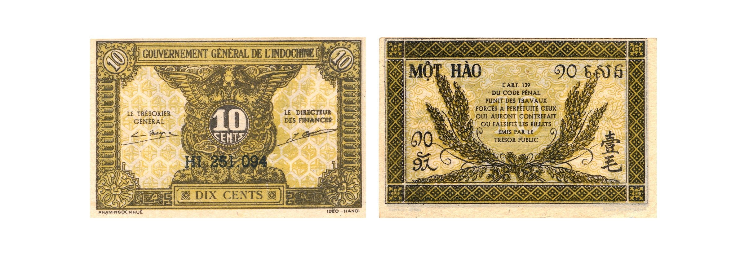 Tiền giấy 10 cents (Một hào): Hình chữ nhật, kích thước 77 x 50 mm, màu vàng đất và xám đen. Mặt trước in mệnh giá “10 cents” giữa hai con phượng. Mặt sau in hình hai nhành lúa, phát hành toàn Đông Dương và mệnh giá bằng chữ Việt Nam, chữ Campuchia, chữ Lào và chữ Hán.