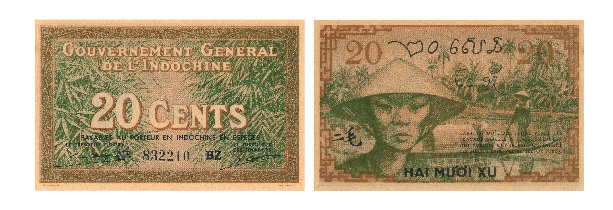 Tiền giấy 20 Cents (Hai mươi xu): Hình chữ nhật, kích thước 105 x 65 mm, màu xanh lá cây và nâu, phát hành toàn Đông Dương. Mô tả kích thước, màu sắc và chi tiết giống với tờ 20 Cents phát hành kỳ 1 (1940) nêu trên.