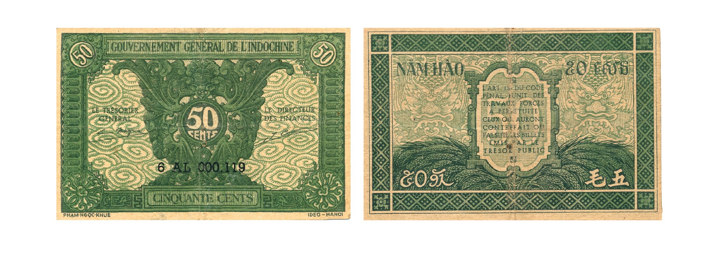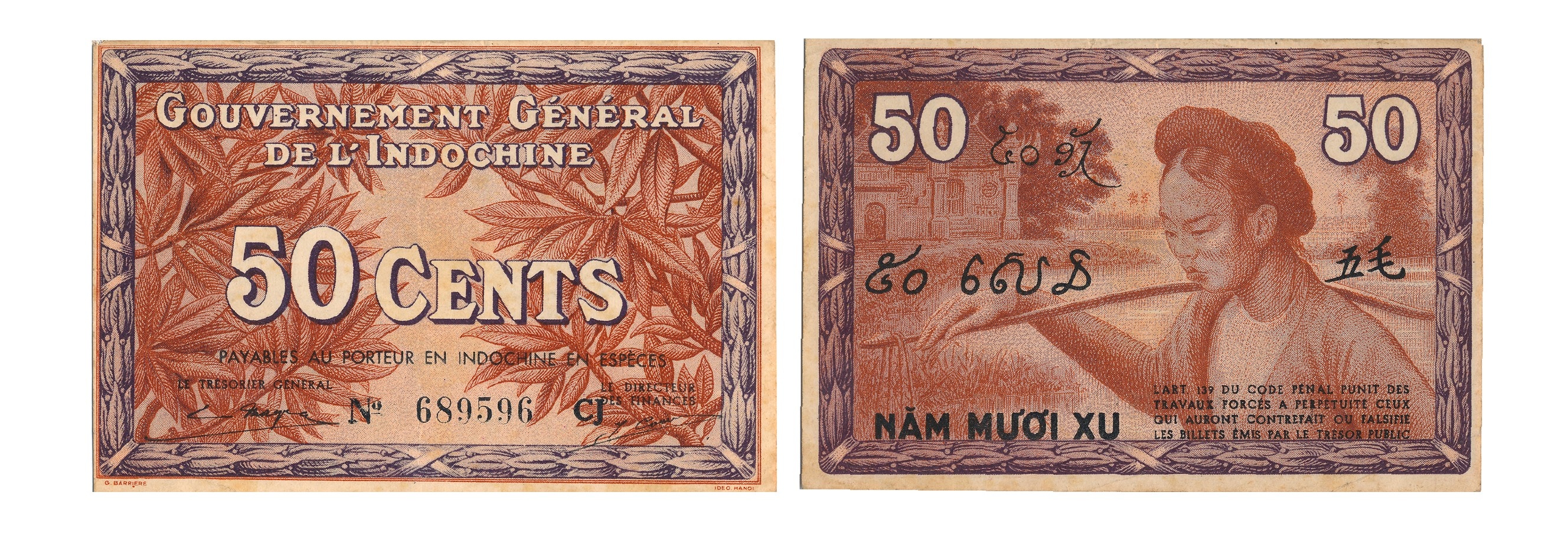 Tiền giấy 50 cents (Năm hào): Hình chữ nhật, kích thước 96 x 53 mm, màu xanh lá cây nhạt và đậm, phát hành toàn Đông Dương. Mặt trước in mệnh giá “50 cents” giữa hoa văn cách điệu hình 3 con dơi. Mặt sau in hoa văn rồng trên bông lúa và mệnh giá bằng chữ Việt Nam, chữ Campuchia, chữ Lào và chữ Hán.