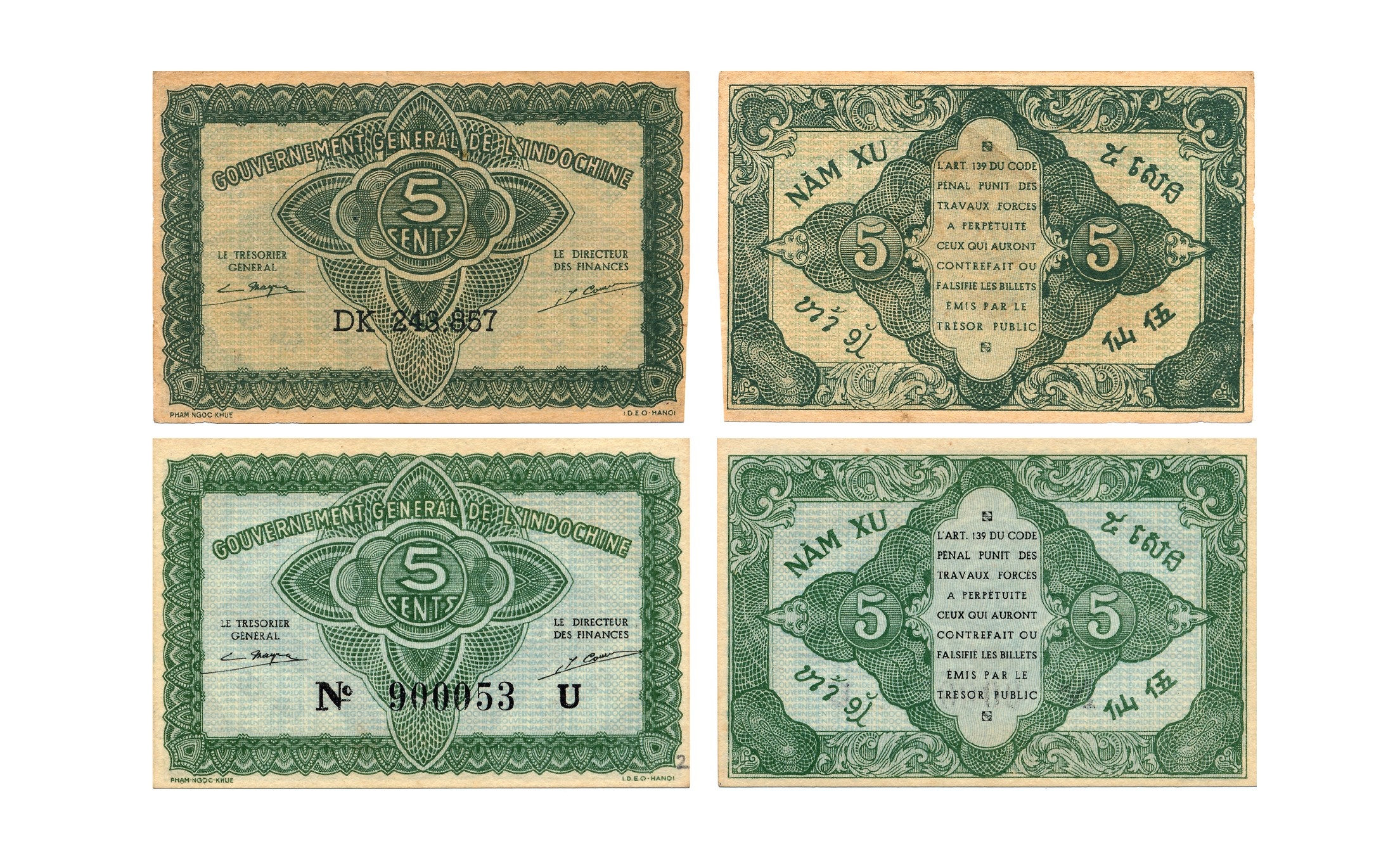 Tiền giấy 5 cents (Năm xu): Hình chữ nhật, kích thước 77 x 50 mm. Màu xanh lá cây nhạt và đậm, chữ số màu đen. Mặt trước in mệnh giá “5 cents” giữa hoa văn. Mặt sau in hoa văn, phát hành toàn Đông Dương. Có 2 loại chữ ký tên màu xanh và màu đen.