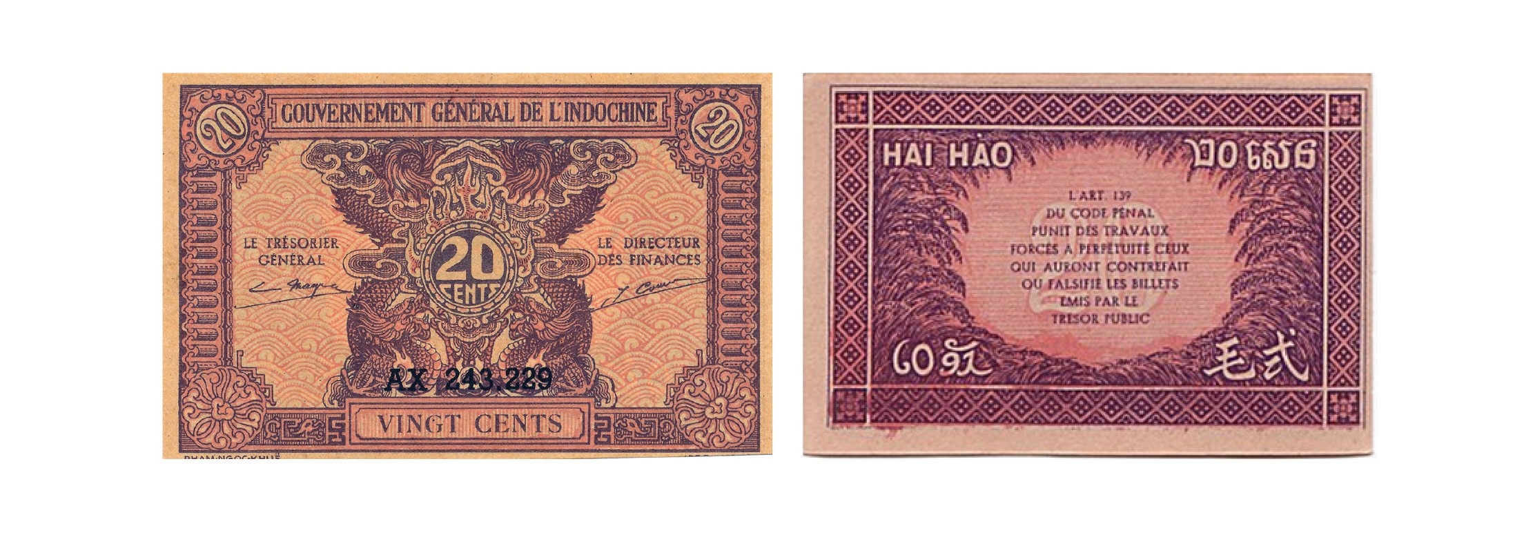 Tiền giấy 20 cents (Hai hào): Hình chữ nhật, kích thước 87 x 57 mm. màu tím và hồng, phát hành toàn Đông Dương. Mặt trước in mệnh giá “20 cents” giữa hai con rồng chầu hai bên. Mặt sau in hoa văn bông lúa và mệnh giá bằng chữ Việt Nam, chữ Campuchia, chữ Lào và chữ Hán.