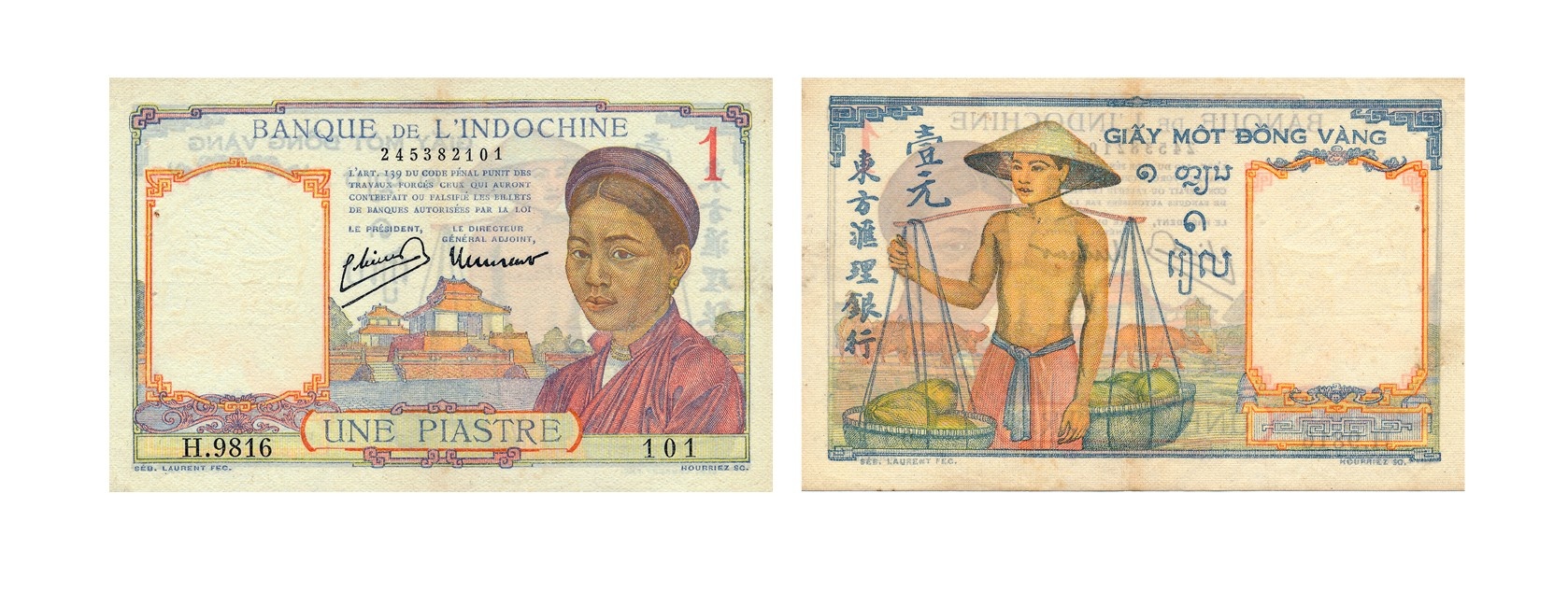 Tiền giấy 1 piastre (Giấy một đồng vàng) : Hình chữ nhật, kích thước 127 x 81 mm, in nhiều màu, phát hành toàn Đông Dương. Mô tả hình ảnh tương tự như tờ 1 piastre phát hành đợt 2, kỳ 3, (1932-1936) nêu ở phần trên, nhưng chỉ khác chữ ký. Đồng thời, tờ tiền 1 piastre thời kỳ này khi được phát hành mặt sau in mệnh giá bằng chữ Việt Nam, chữ Lào, chữ Campuchia và chữ Hán.