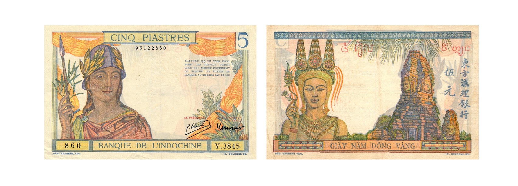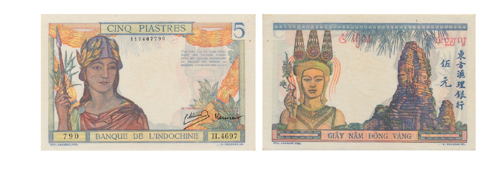 Tiền giấy 5 piastres (Giấy năm đồng vàng): Hình chữ nhật, kích thước 140 x 90 mm, in nhiều màu, mặt sau in mệnh giá bằng chữ Lào cũ, phát hành toàn Đông Dương. Mô tả hình ảnh tương tự như tờ 5 piastres phát hành kỳ 3 (1932 - 1936) nêu ở phần trên nhưng chỉ khác chữ ký. Tương tự tờ 1 piastre, tờ tiền 5 piastres, khi được phát hành mặt sau in mệnh giá bằng chữ Việt Nam, chữ Lào, chữ Campuchia và chữ Hán.