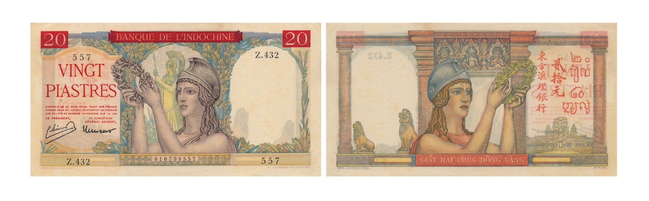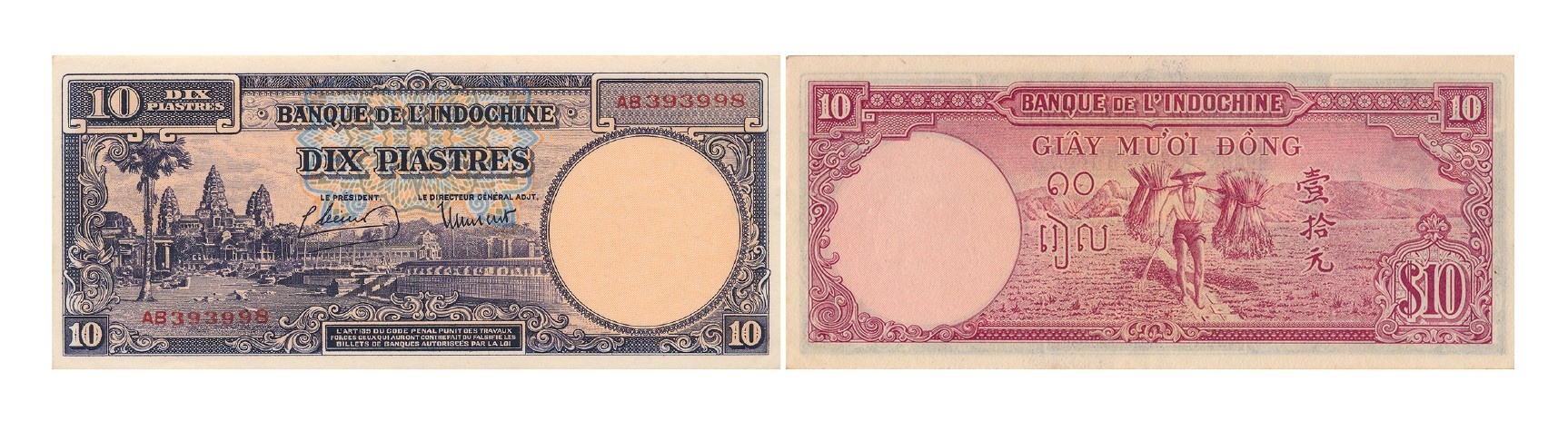 Tiền giấy 10 piastres (Giấy mười đồng): Hình chữ nhật, kích thước 140 x 60 mm, in tại nước Anh, màu đỏ nâu và tím đen, phát hành năm 1947 trên toàn Đông Dương. Mặt trước in cảnh Hoàng thành Angkor Thom - Campuchia. Mặt sau in hình ảnh nông dân Việt đang gánh lúa.