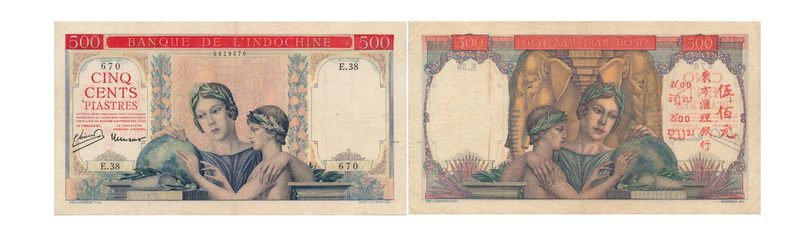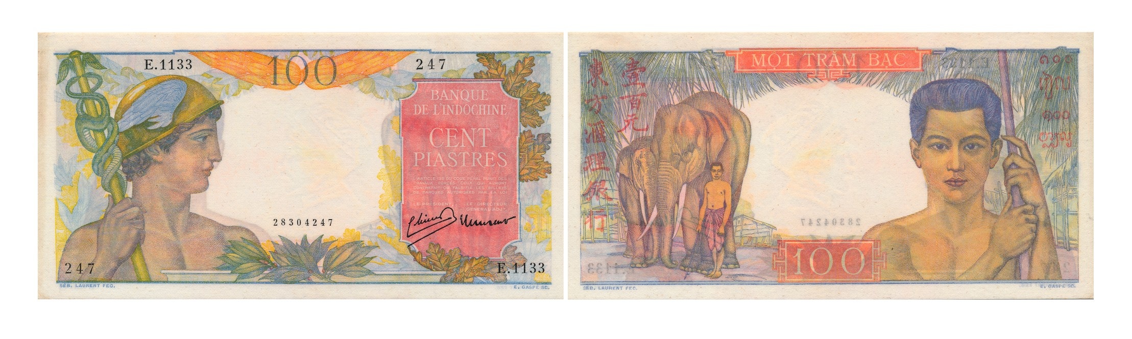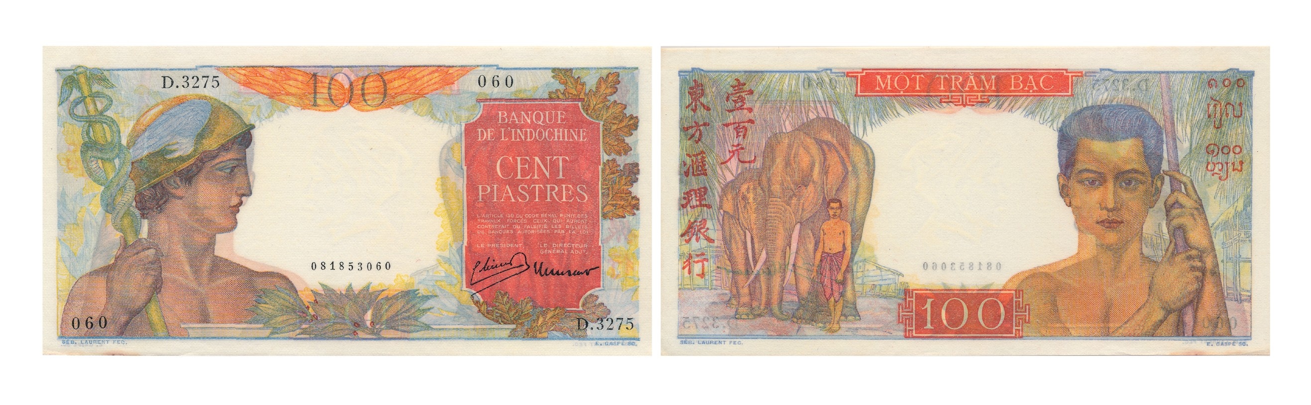 Tiền giấy 100 piastres (Một trăm bạc): Hình chữ nhật, kích thước 177 x 90 mm, in nhiều màu tại Pháp, phát hành năm 1947 trên toàn Đông Dương. Mặt trước in biểu tượng thần Hermes (Thần bảo hộ Thương nghiệp) và mệnh giá 100 piastres. Mặt sau in chân dung người đàn ông Lào cầm lao, hình ảnh người quản tượng và 2 con voi, mệnh giá bằng chữ Việt Nam, chữ Lào, chữ Campuchia và chữ Hán.