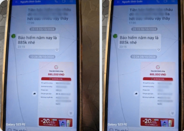 Trao đổi với phóng viên, bà Nguyễn Thị B, phụ huynh của em Đ.T. K.H, cho biết: “Tôi đã hỏi thầy Quân và được thông báo số tiền phải đóng là 885.000 đồng. Tôi chuyển khoản ngay và giữ lại tin nhắn”. Các tin nhắn được cung cấp đều thể hiện rõ thời gian và nội dung giao dịch. Bi hài nhất có lẽ là trường hợp của học sinh L.T.T.H của lớp 9C, gần đây khi đi khám bệnh, gia đình mới biết Thẻ bảo hiểm y tế của em H đã hết hạn sử dụng từ 31/12/2023, chưa được gia hạn thêm.