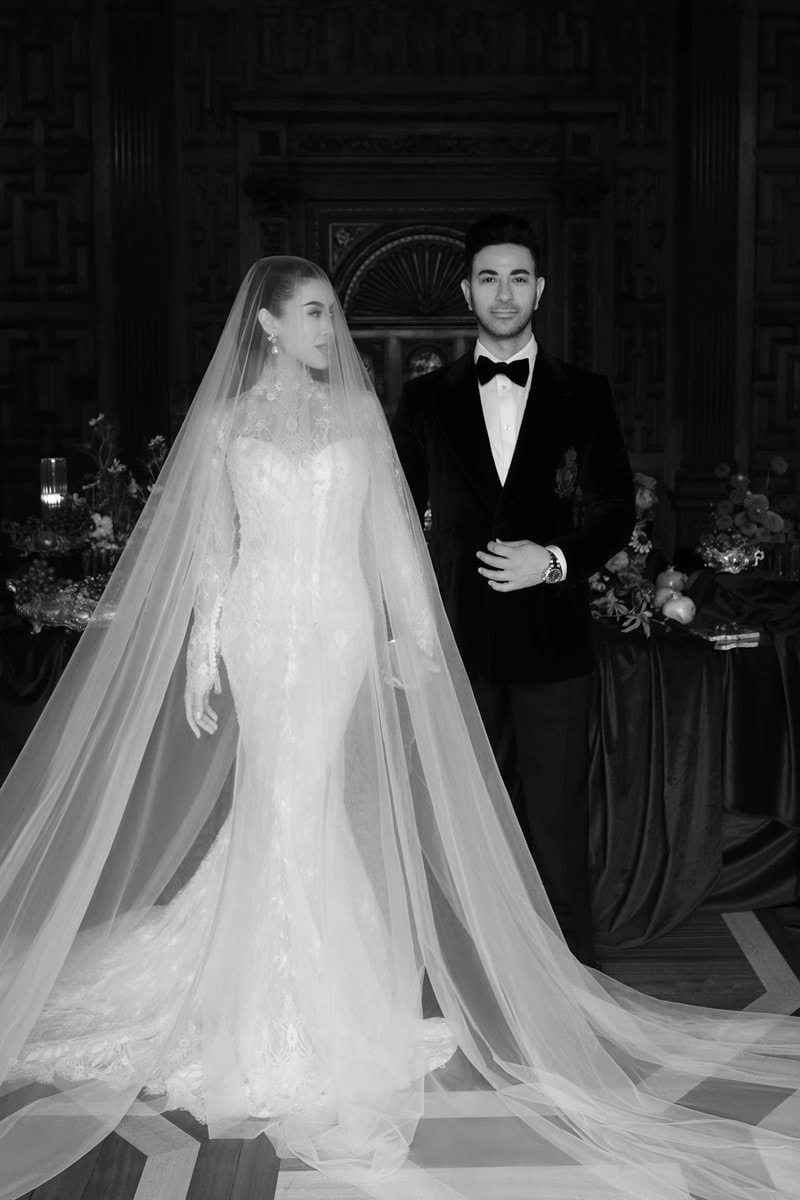 Trong bộ ảnh, Tiên Nguyễn diện các thiết kế váy cưới tinh xảo từ những thương hiệu cao cấp như Nicole Felicia Couture, Berta và Pallas Couture Priveé. Các bộ trang phục đa dạng từ kiểu ren bó sát đến đầm quây cúp ngực, nổi bật với mẫu đầm đính hoa kết hợp khăn voan dài. Chú rể Justin Cohen lịch lãm trong bộ tuxedo của Dolce&Gabbana.