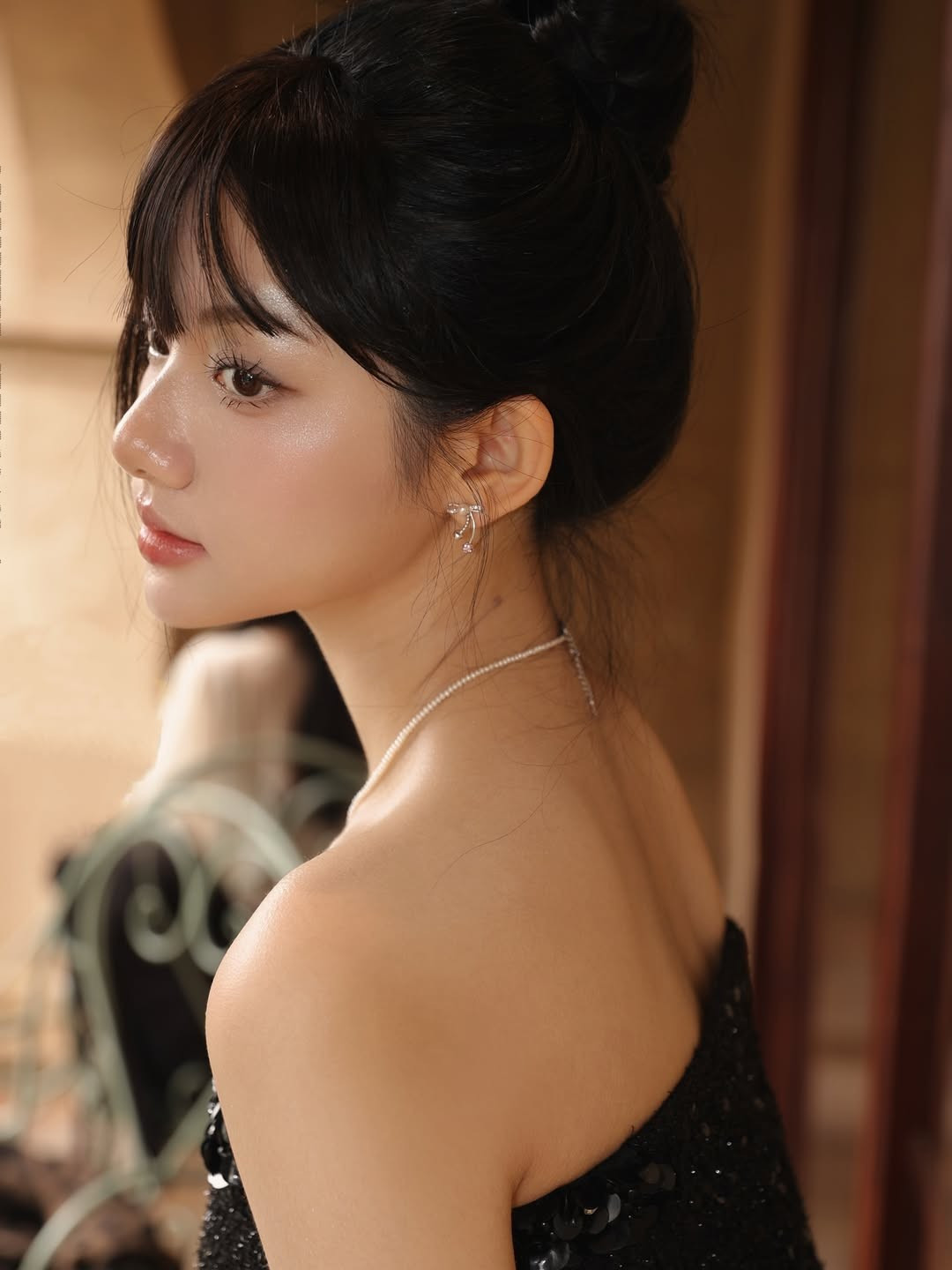 Mái tóc được búi cao gọn gàng, vẫn giữ phần tóc mái lưa thưa quen thuộc nhưng được tạo kiểu trưởng thành hơn. Phong cách trang điểm nhẹ nhàng, nhấn vào đôi mắt to tròn và làn da căng bóng, không quá sắc sảo mà vẫn toát lên thần thái cuốn hút. (Ảnh: IGNV)