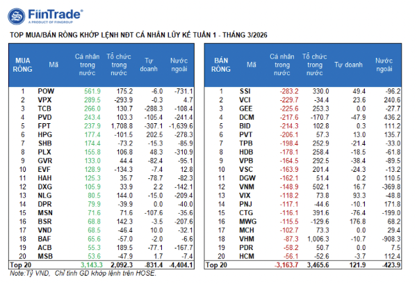 Tính riêng giao dịch khớp lệnh, họ mua ròng 9/18 ngành, chủ yếu là ngành Điện, nước & xăng dầu khí đốt. Top mua ròng của nhà đầu tư cá nhân tập trung gồm: POW, VPX, TCB, PVD, FPT, HPG, SHB, PLX, GVR, EVF.