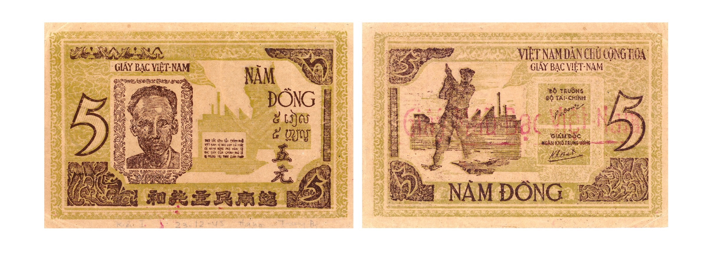 Giấy bạc 5 đồng: Phát hành hai đợt với màu sắc và họa tiết khác nhau. Giấy bạc 5 đồng phát hành giai đoạn 1945 - 1946 có kích thước 128 x 86mm, cả hai mặt màu xanh nâu. Mặt trước, phía trái, trên là dòng chữ “GIẤY BẠC VIỆT-NAM”, dưới là chân dung Chủ tịch Hồ Chí Minh trong khung ảnh, bên trái ảnh Bác là số “5”; chính giữa là nhà máy đang nhả khói, dưới đó là Sắc lệnh Chính phủ chống làm giả và phá hoại tờ bạc. Bên phải có chữ “NĂM ĐỒNG” bằng chữ Việt, chữ Lào và chữ Hán, phía dưới cùng là dòng chữ Hán “VIỆT NAM DÂN CHỦ CỘNG HÒA”. Mặt sau, trên là dòng chữ “VIỆT NAM DÂN CHỦ CỘNG HÒA”, dưới đó là “GIẤY BẠC VIỆT NAM”, dưới cùng là dòng chữ ”NĂM ĐỒNG”, bên trái là hình ảnh công binh xưởng, giữa là chữ ký của Bộ trưởng Bộ Tài chính Phạm Văn Đồng và chữ ký của Giám đốc Ngân khố Trung ương Nguyễn Văn Khoát. Tờ giấy bạc 5 đồng phát hành năm 1949 -1951 kích thước 129 x 64mm, cả hai mặt màu nâu đỏ. Tờ giấy bạc này được in theo hình chữ nhật nằm dọc. Mặt trước, trên là dòng chữ “ VIỆT NAM DÂN CHỦ CỘNG HÒA” bằng chữ Hán, dưới là chữ Việt đứng khung hình chữ bát, tiếp đó là chân dung Chủ tịch Hồ Chí Minh, phía dưới là chữ “GIẤY NĂM ĐỒNG” (chữ Việt) và “Ngũ nguyên”, dưới cùng là chữ số “5” trong vòng hai con rồng uốn khúc, đuôi là hai ngôi sao 5 cánh, số series là 698. Mặt sau được trình bày trong khung hình vòm cửa, trên là chữ “Năm đồng” (chữ Lào), dưới đó là Sắc lệnh Chính phủ chống làm giả và phá hoại đồng bạc, tiếp đến là chữ ký Giám đốc Ngân khố Trung ương Nguyễn Văn Khoát, trên chữ ký là chữ số “5”, có hai con rồng chầu vào, dưới cùng là hình một nữ nông dân vấn khăn, tay ôm bó lúa và một em bé đứng cạnh. Giấy bạc này được đóng dấu “Giấy mẫu bạc Việt Nam” theo chiều dọc, có nghĩa là giấy bạc mẫu.