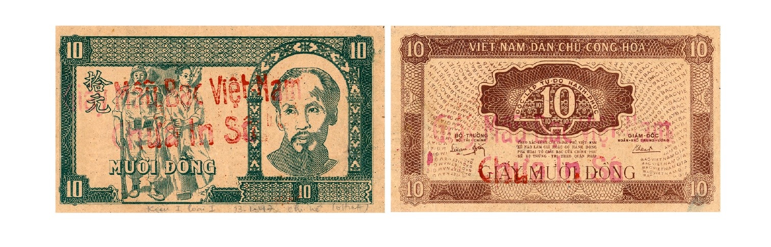 Giấy bạc 10 đồng: Kích thước 140 x 80mm. Mặt trước màu xanh lá cây đậm, bên trái in hình chiến sĩ cầm súng đứng cạnh nữ nông dân cầm cuốc, có chữ ”MƯỜI ĐỒNG” (chữ Việt) và “Thập nguyên”- 拾元, bên phải là chân dung Chủ tịch Hồ Chí Minh. Mặt sau màu nâu, trên có dòng chữ “VIỆT NAM DÂN CHỦ CỘNG HÒA”, giữa là số “10” to và 3 số “10” nhỏ nằm trong khung hình bán nguyệt có dòng chữ “ĐỘC-LẬP TỰ -DO HẠNH-PHÚC”, bên trái là chữ ký Bộ trưởng Bộ Tài chính Lê Văn Hiến và Giám đốc Ngân khố trung ương Nguyễn Văn Khoát bên phải, giữa là sắc lệnh Chính phủ chống làm giả và phá hoại đồng bạc Việt Nam.