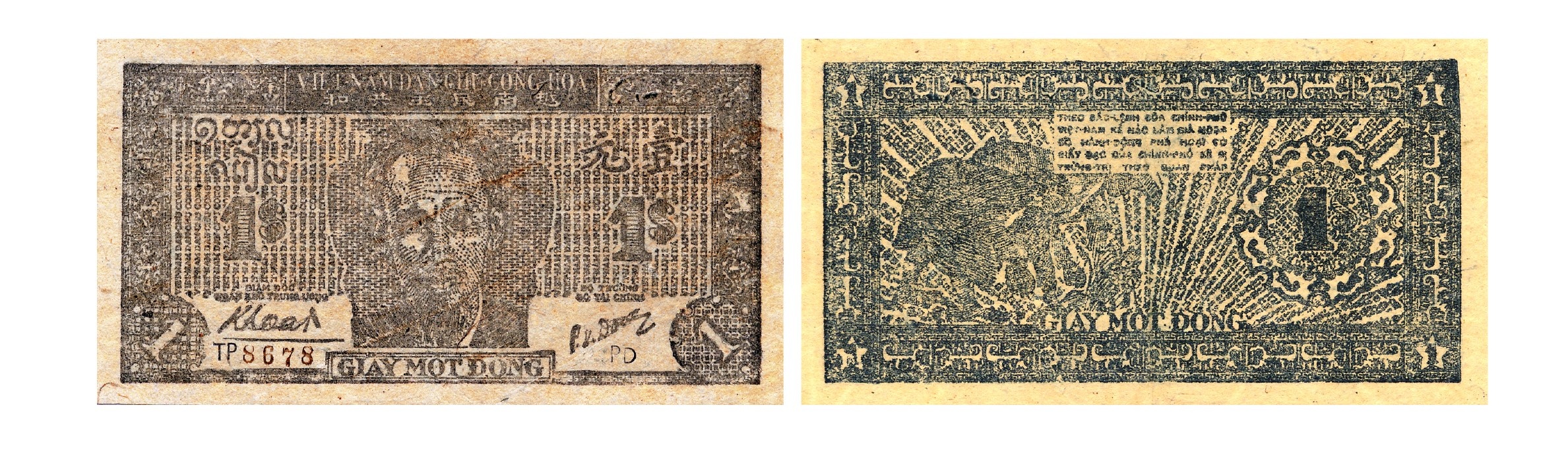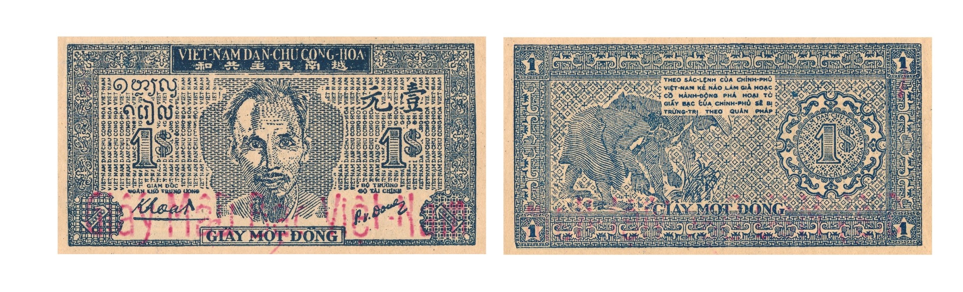 Giấy bạc 1 đồng: Kích thước 112 x 61mm, cả hai mặt màu xanh dương. Mặt trước phía trên là hai dòng chữ viết bằng chữ Việt và chữ Hán “VIỆT-NAM DÂN- CHỦ CỘNG-HÒA”, giữa là chân dung Chủ tịch Hồ Chí Minh nhìn thẳng, bên trái phía trên có chữ “Một Đồng” viết bằng tiếng Lào, dưới là chữ số “1$”, dưới là chữ ký của Giám đốc Ngân khố Trung ương Nguyễn Văn Khoát; bên phải phía trên là hai chữ Hán “Nhất nguyên”- 壹元, dưới là 1 đồng viết số “1$”, chữ ký của Bộ trưởng Bộ Tài chính Phạm Văn Đồng. Mặt sau, chính giữa là sắc lệnh của Chính phủ, bên phải là “1$”, bên trái là hai phụ nữ đang cấy, xung quanh được viền bằng hình hoa văn. Tiền 1 đồng có hai loại: một loại như trên, một loại có tia nắng tỏa trên đồng ruộng.