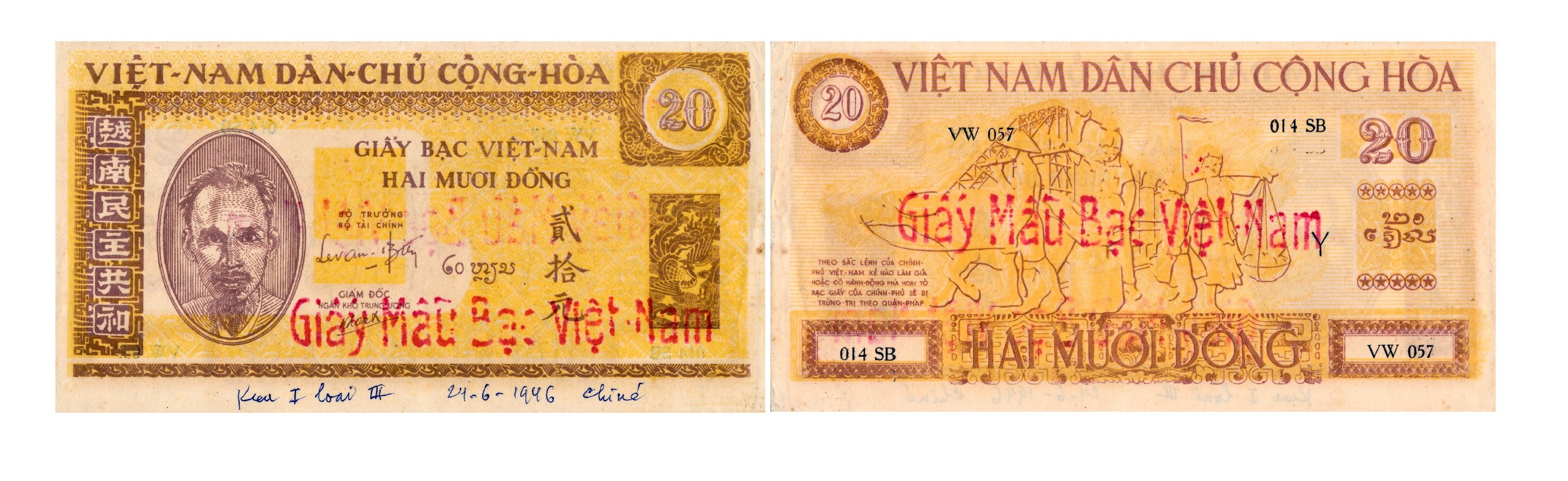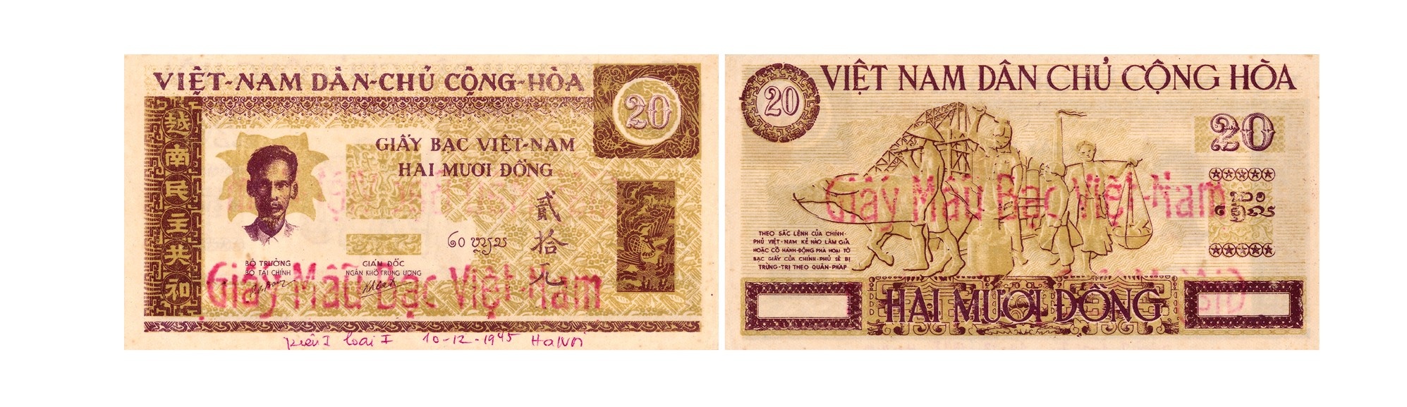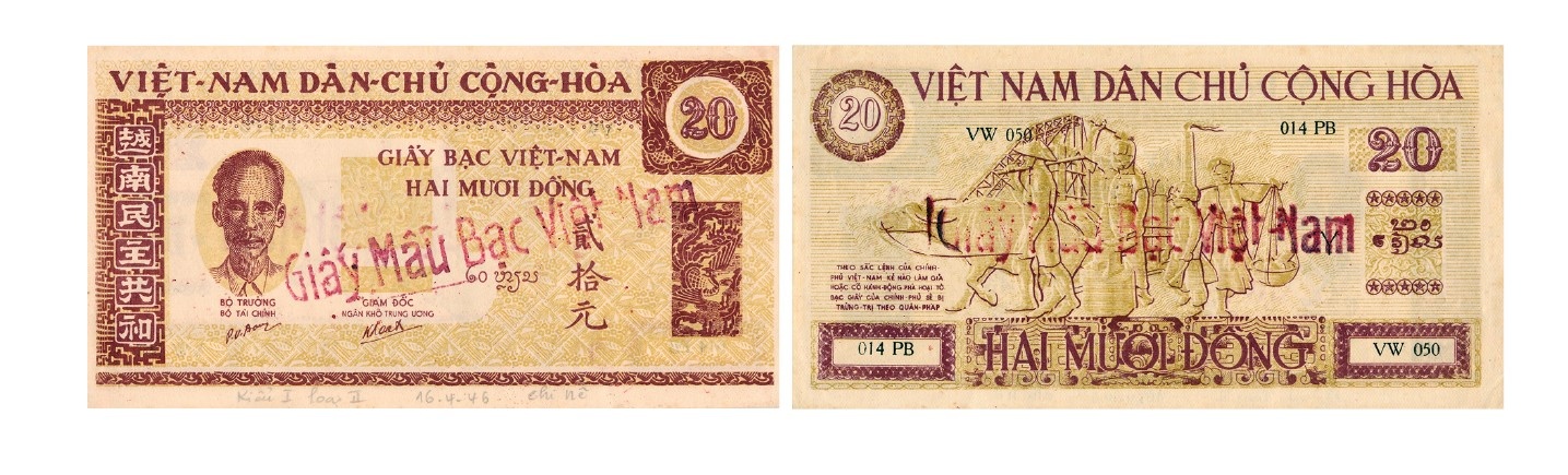Đợt 1 (1946 - 1949) có nhiều kích thước khác nhau, cả hai mặt màu nâu vàng. Mặt trước, trên là dòng chữ “VIỆT –NAM DÂN- CHỦ CỘNG -HÒA”, bên trái là chân dung Chủ tịch Hồ Chí Minh, bên trái chân dung Bác là dòng chữ Hán “Việt Nam dân chủ cộng hòa”, giữa là dòng chữ “GIẤY BẠC VIỆT NAM” “ HAI MƯƠI ĐỒNG”, có chữ ký của Bộ trưởng Bộ Tài chính Lê Văn Hiến, chữ “Hai mươi đồng” (chữ Lào), “Nhị thập nguyên”-貳拾元, bên phải phía trên có chữ số “20”, dưới là hình con rồng trong khung hình chữ nhật, có dấu “Giấy mẫu bạc Việt Nam”. Mặt sau trên cùng là dòng chữ “VIỆT NAM DÂN CHỦ CỘNG HÒA”, dưới cùng là chữ “HAI MƯƠI ĐỒNG”, giữa là hình sĩ - nông - công - thương, góc dưới bên trái là sắc lệnh Chính phủ chống làm giả và phá hoại đồng bạc, series 014SB-VW057, có đóng dấu “Giấy mẫu bạc Việt Nam”.