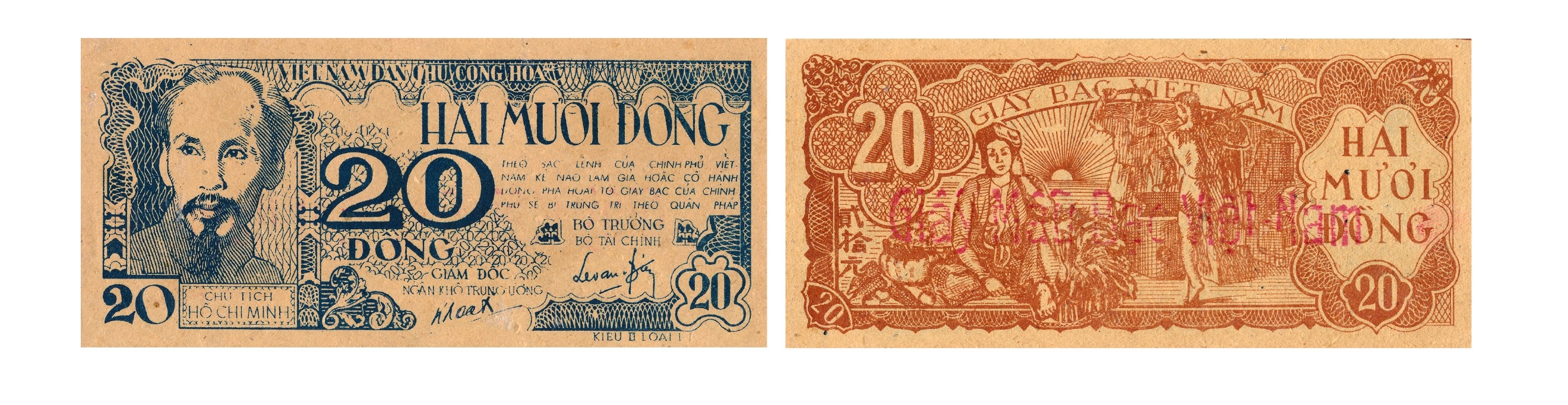 Đợt 2 (1949 - 1951), tờ có hình minh họa dưới đây có kích thước 148 x 68mm. Mặt trước màu xanh dương, mặt sau màu nâu đỏ, trên cùng là dòng chữ “VIỆT NAM DÂN CHỦ CỘNG HÒA”, bên trái là chân dung Hồ Chủ tịch, bên phải là chữ “HAI MƯƠI ĐỒNG”, giữa là số “20”. Bên trái là sắc lệnh của Chính phủ chống làm bạc giả hoặc phá hoại bạc Việt Nam, chữ ký của Bộ trưởng Bộ Tài chính Lê Văn Hiến và Giám đốc Ngân khố Trung ương Nguyễn Văn Khoát. Mặt sau dòng chữ “GIẤY BẠC VIỆT NAM” trong khung và chữ “HAI MƯƠI ĐỒNG”, góc trái có 3 chữ “Nhị thập nguyên” - 貳拾元, giữa là hình ảnh phụ nữ bên bó lúa, hai công nhân đang quai búa, series KL 099.