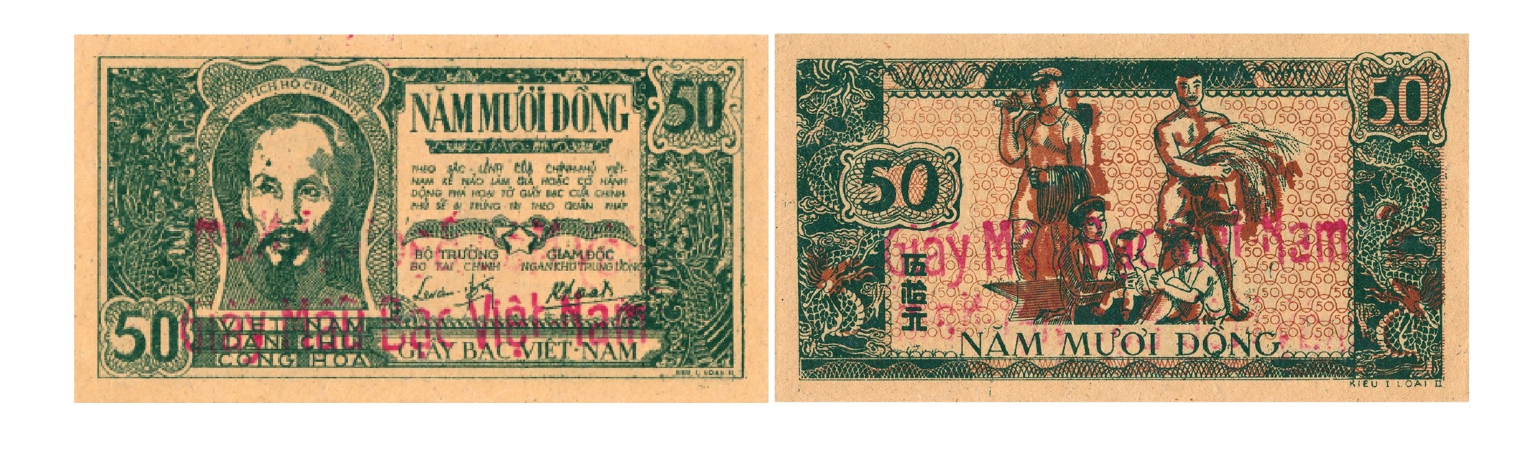 Đợt 1 phát hành năm 1946, kích thước 170 x 90mm, cả hai mặt màu xanh dương đậm và nâu đỏ. Mặt trước, phía trên là dòng chữ “VIỆT NAM DÂN CHỦ CỘNG HÒA”, chính giữa là chân dung Chủ tịch Hồ Chí Minh trong khuôn hình bầu dục, bên trái là sắc lệnh Chính phủ chống làm bạc giả hoặc phá hoại đồng bạc Việt Nam. Dưới đó là chữ “NĂM MƯƠI ĐỒNG” chữ Lào, chữ ký của Giám đốc Ngân khố Trung ương Nguyễn Văn Khoát, bên phải là chữ “NĂM MƯƠI ĐỒNG”, dưới là “Ngũ thập nguyên” - 伍拾元, bên trái là con phượng bên phải là con rồng. Mặt sau, trên là dòng chữ “VIỆT-NAM DÂN-CHỦ CỘNG-HÒA” (chữ Việt), bên trái là chữ Hán “Việt Nam dân chủ cộng hòa” viết theo dọc biên, giữa là hình ảnh hai công nhân đứng máy, nông dân vác bừa, dắt trâu và gánh lúa, hai góc viết chữ số 50, 1 góc viết chữ Hán “Ngũ thập nguyên” - 伍拾元.