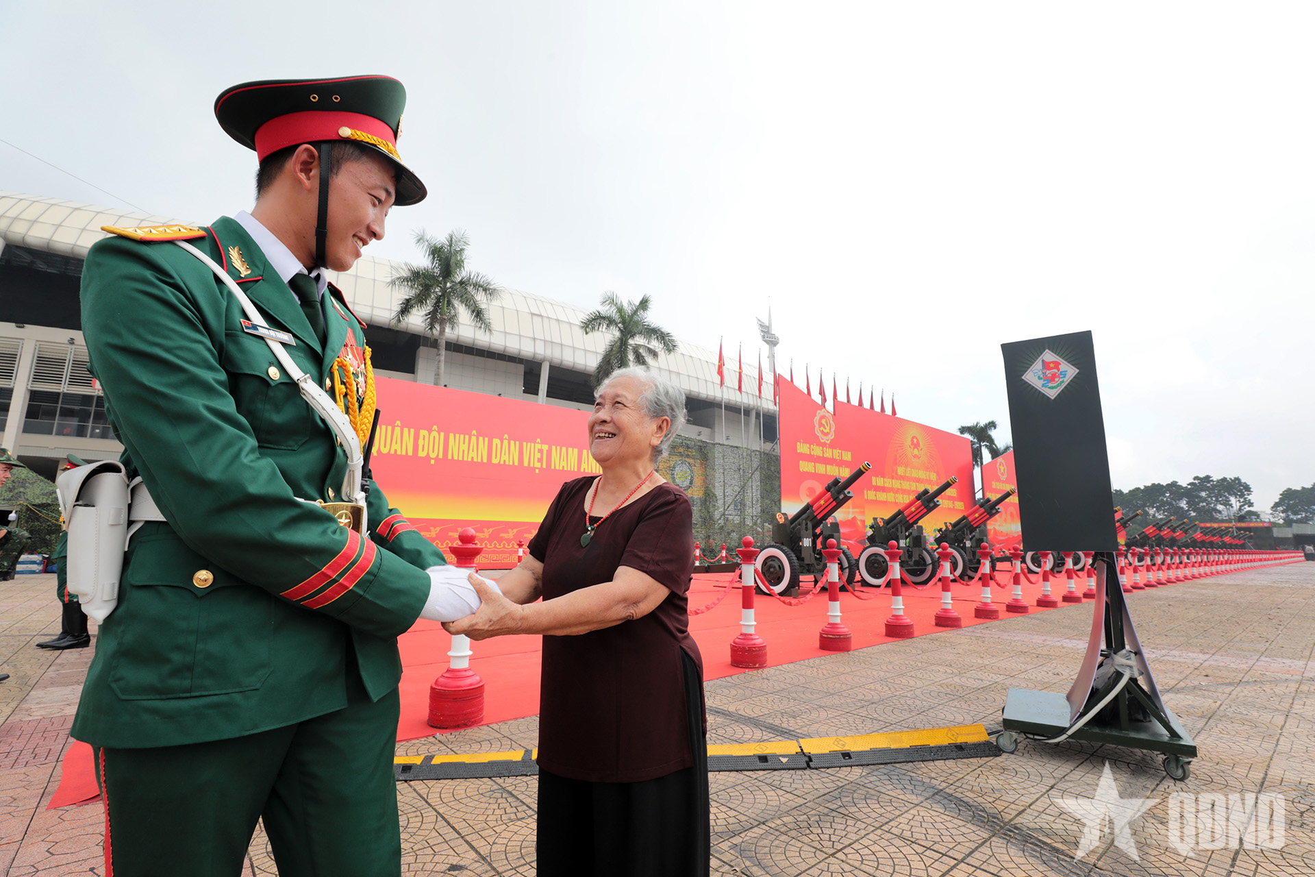 Bà Nguyễn Thị Bạ (90 tuổi ở Quốc Oai- Sơn Tây) lần đầu được xem trực tiếp pháo lễ cảm thấy rất xúc động và tự hào về pháo binh Việt Nam.