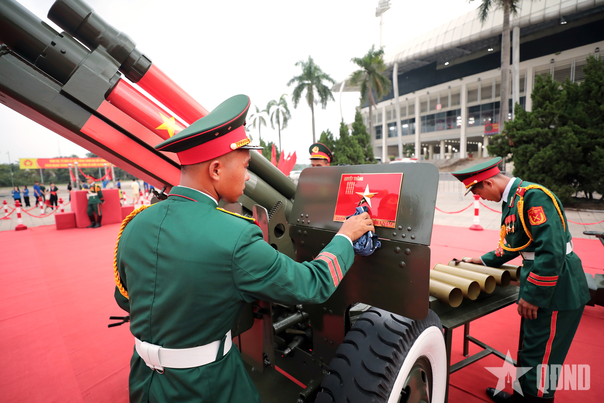 Các chiến sĩ pháo binh tỉ mỉ bảo quản khí tài trước buổi lễ.