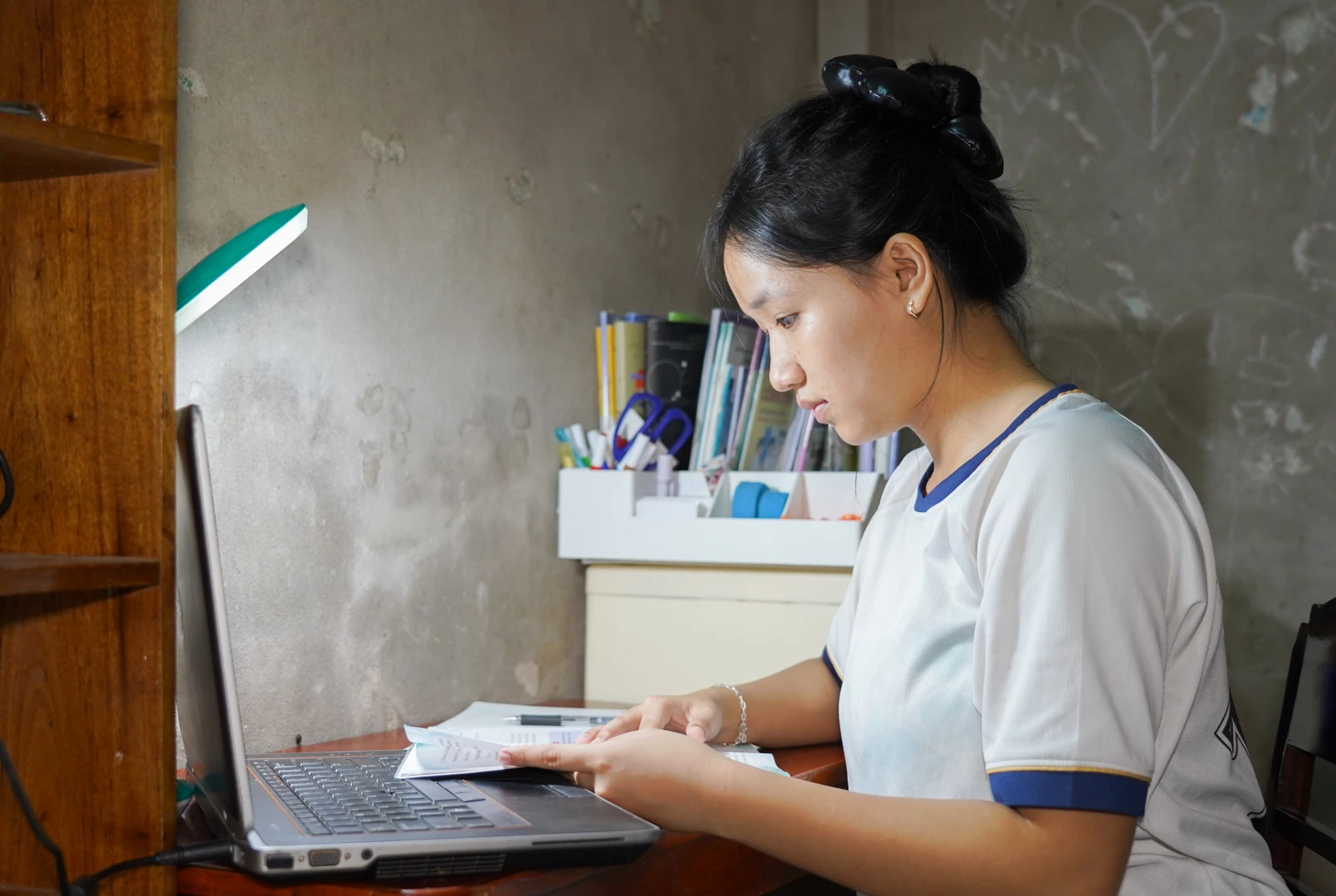 Từ khi có tiếng loa nhắc học bài, việc học tại nhà của em Phan Quỳnh Thư có nền nếp hơn - Ảnh: L.T