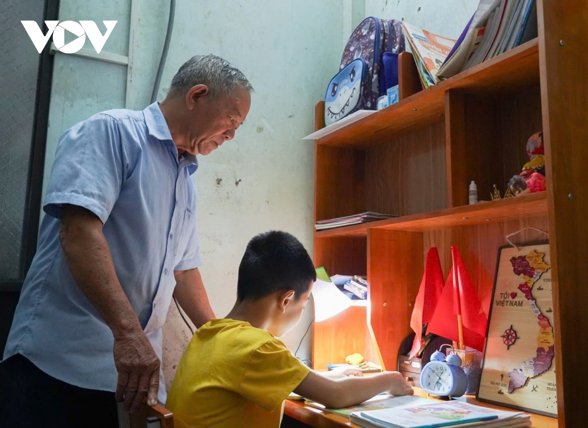 Ông Hoàng Văn Bình nhắc cháu mình ngồi vào bàn học khi tiếng loa học bài vang lên