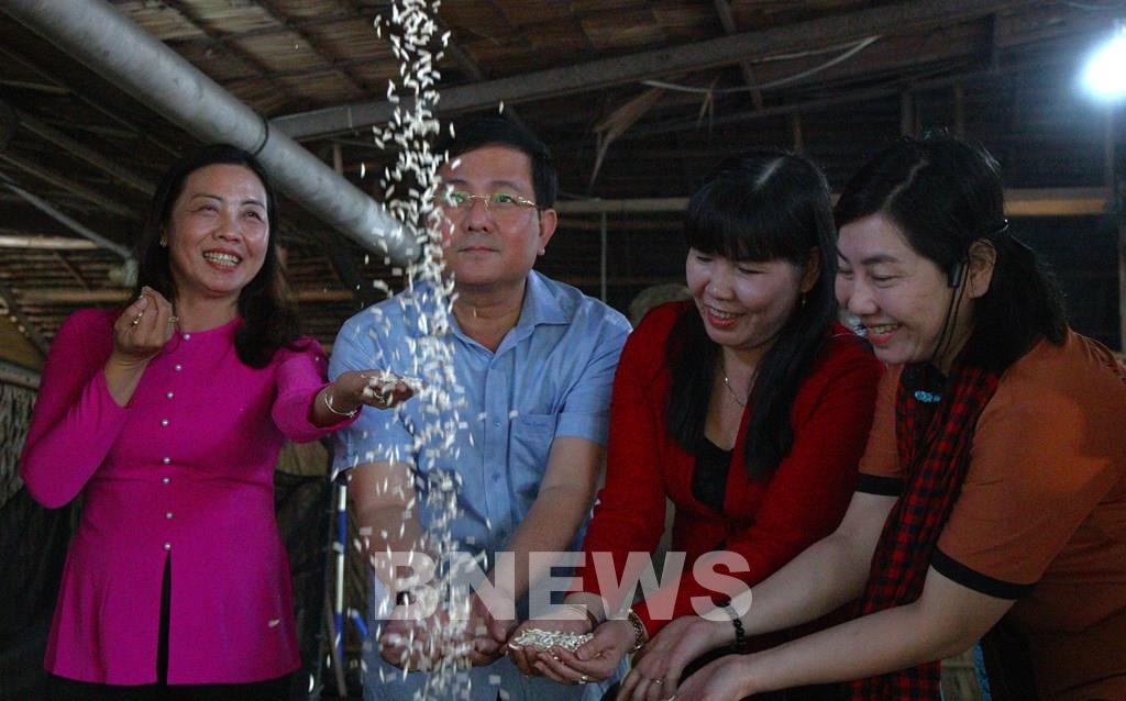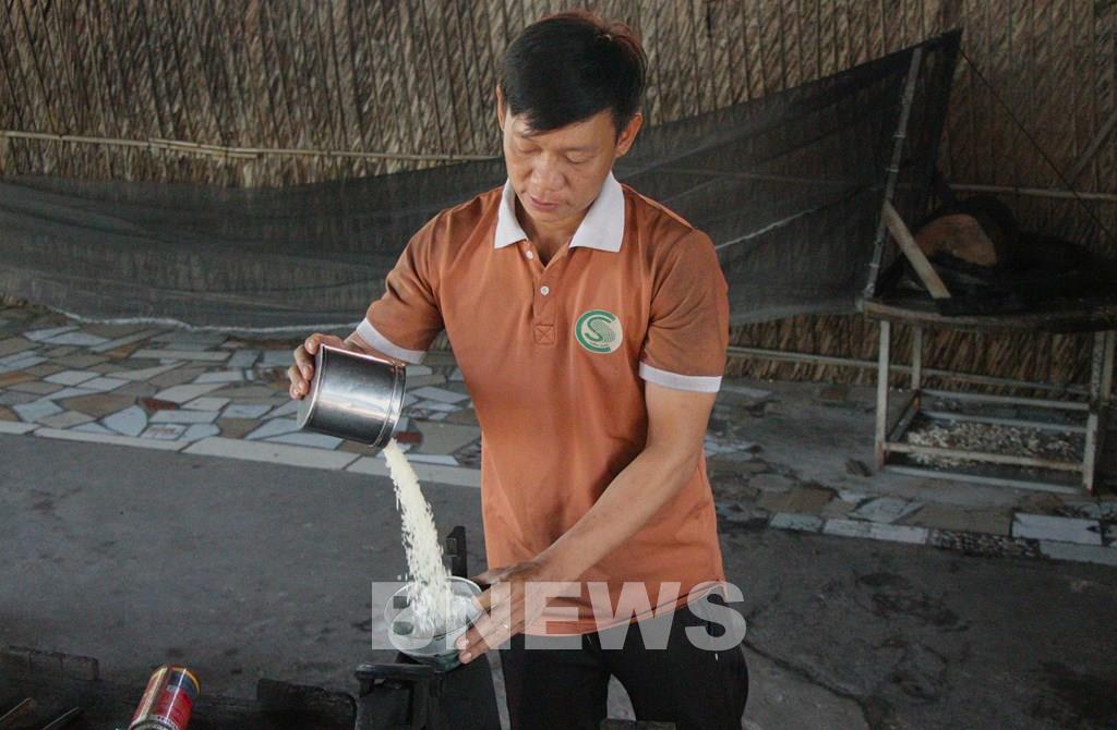 Để cốm nở đều và xốp người thợ chọn loại gạo ngon, không bị nát và phải phơi thật khô để khi gặp áp suất cao, hạt mới bung nở tối đa. Ảnh: Nguyễn Hằng – TTXVN