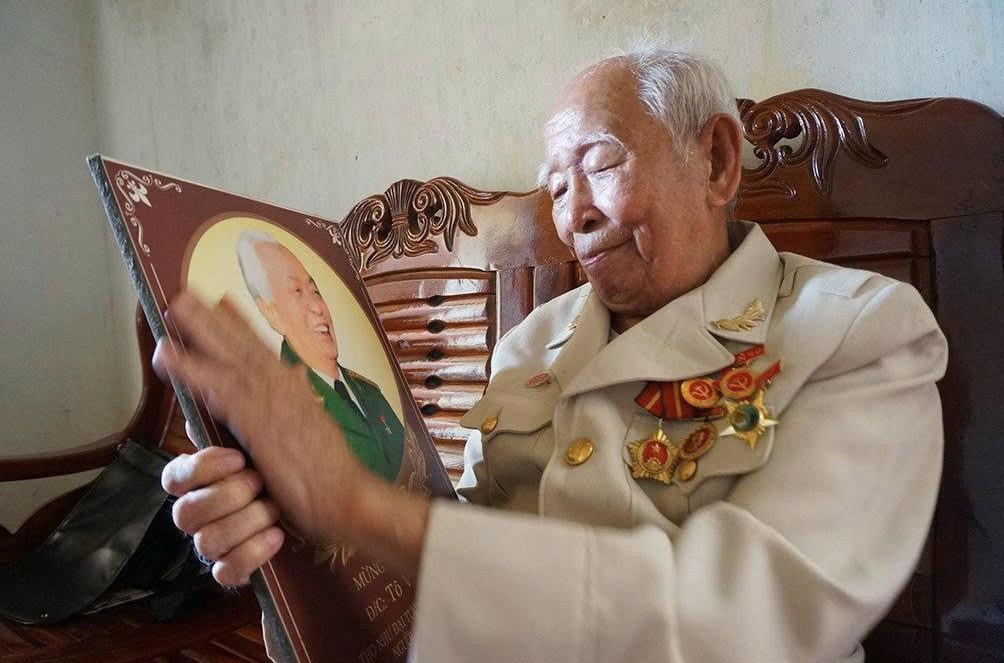 Cụ Tô Đình Cắm nâng niu di ảnh Đại tướng Võ Nguyên Giáp. Ảnh: Phước Đạt