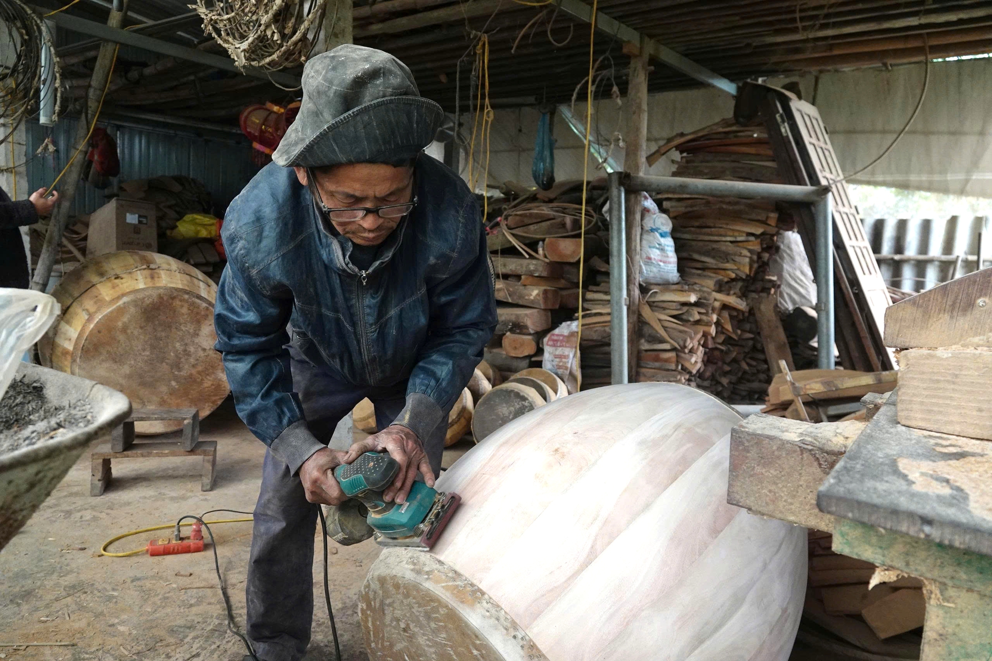 Không khí vào vụ Tết khiến làng nghề làm trống truyền thống lại tất bật. Người già, người trẻ ai còn gắn bó với nghề đều miệt mài bên từng thớ gỗ, tấm da bò để kịp những đơn hàng cuối năm.
