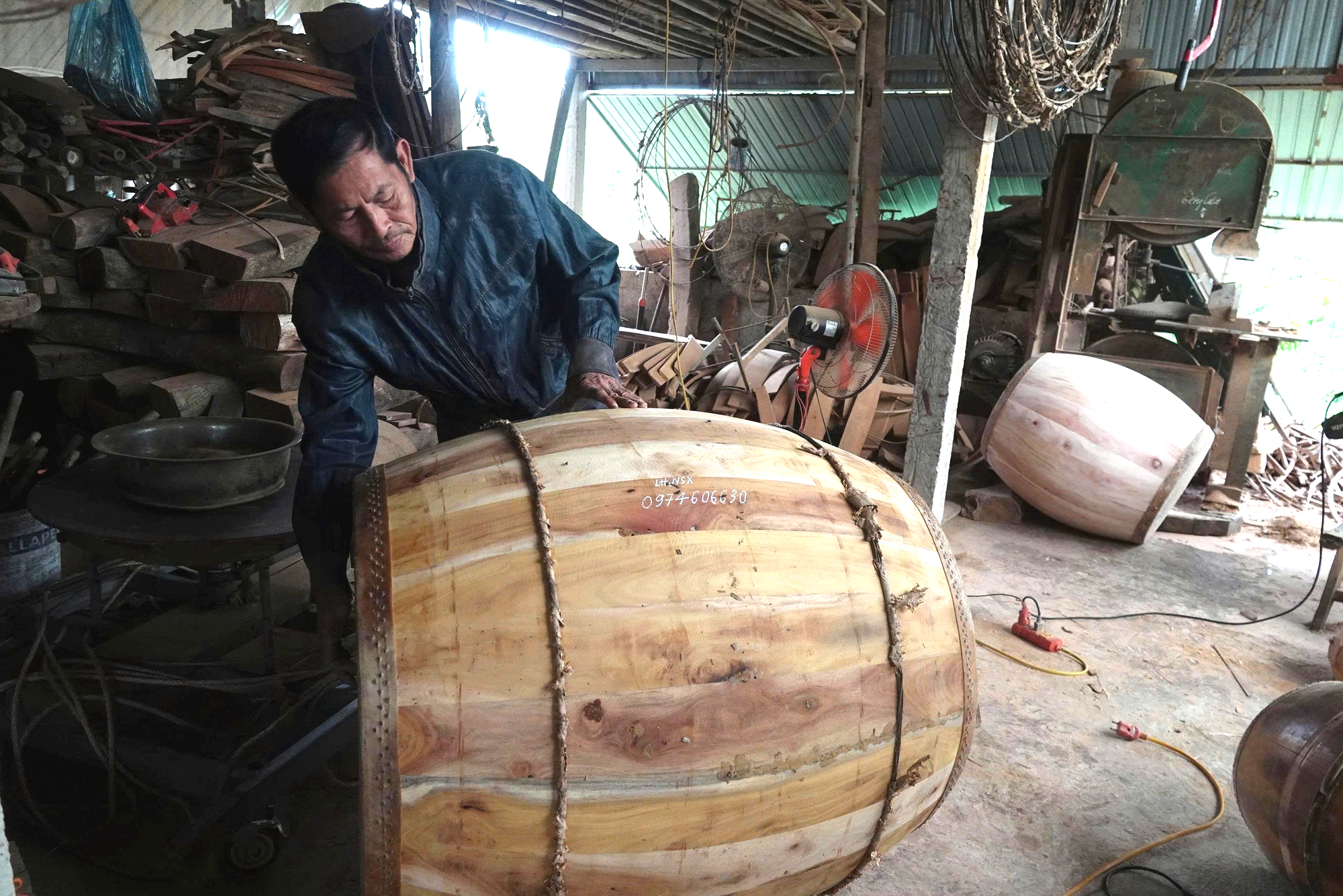 Ông Tráng kể, 4 năm trước, ông làm chiếc trống lớn nhất có đường kính 1,4m, cao khoảng 1,7m, bán 43 triệu đồng. Với chiếc trống đó, thời điểm này, giá bán có thể 50 triệu đồng. Những chiếc trống lớn như vậy thường sản xuất theo đơn đặt hàng, nếu không làm ra sợ khó bán vì giá khá cao.