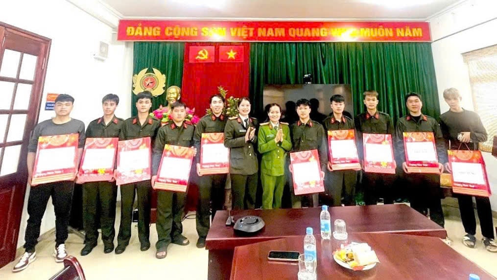 Lãnh đạo Công an phường Xuân Đỉnh tặng quà cho các tân binh chuẩn bị lên đường thực hiện nghĩa vụ CAND năm 2026. Ảnh: PV