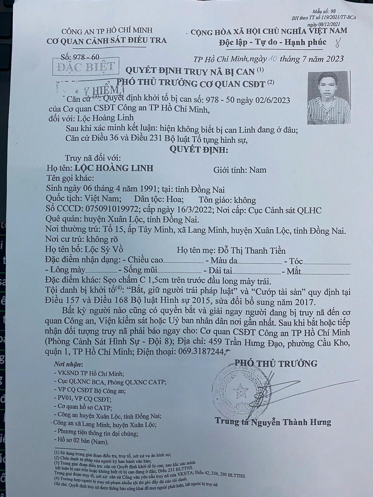 Qua kiểm tra hệ thống quản lý xuất nhập cảnh, lực lượng Biên phòng xác định: Lộc Hoàng Linh thuộc diện cấm xuất cảnh, theo Quyết định truy nã số 978-60 ngày 10/7/2023 của Cơ quan Cảnh sát điều tra, Công an TP. Hồ Chí Minh, về hành vi “Bắt, giữ người trái pháp luật” và “Cướp tài sản”.