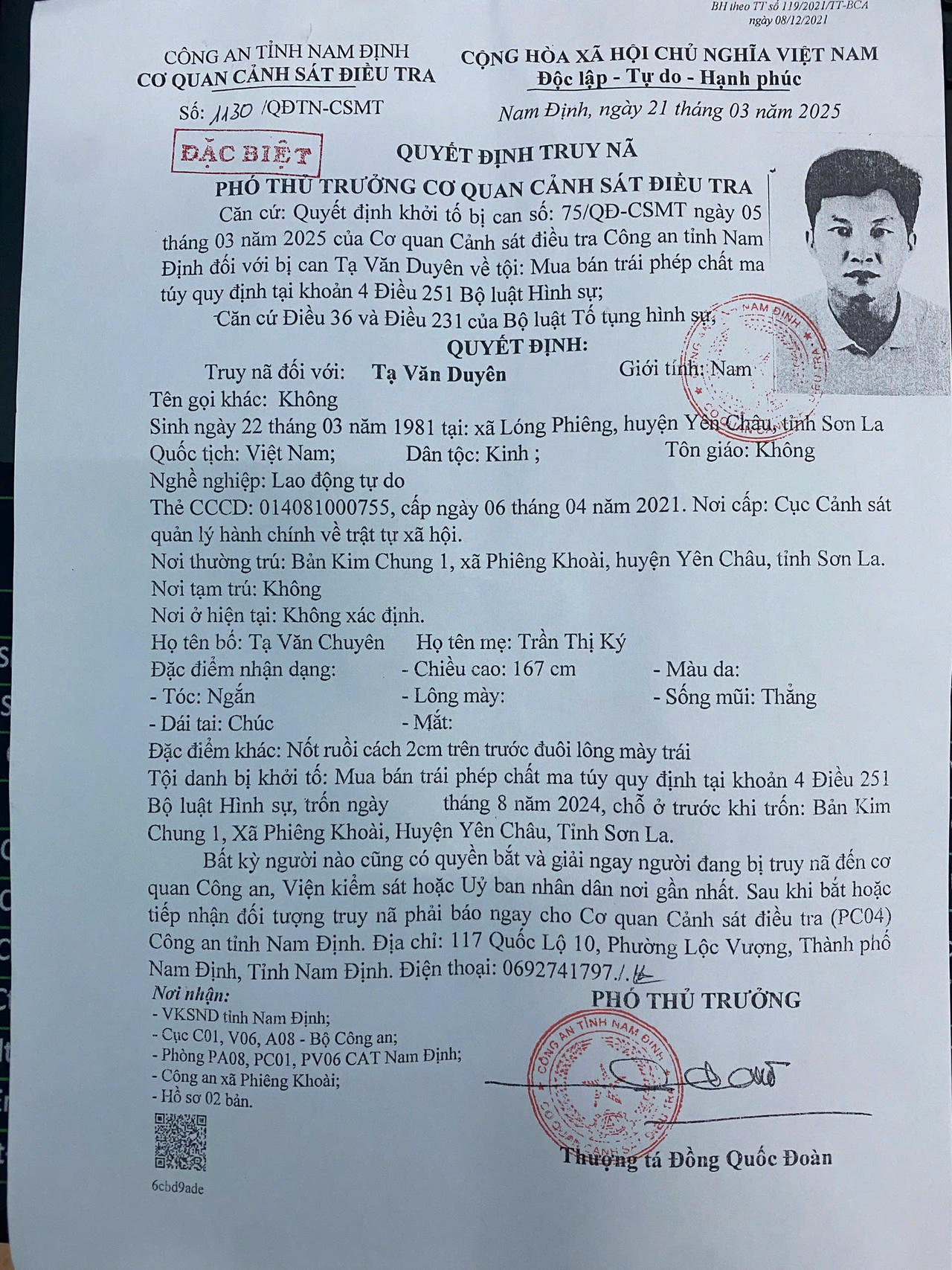 Tạ Văn Duyên cũng nằm trong danh sách cấm xuất cảnh, theo Quyết định truy nã số 1130/QĐTN-CSMT ngày 21/3/2025 của Cơ quan Cảnh sát điều tra, Công an tỉnh Nam Định (nay là Ninh Bình), về tội “Mua bán trái phép chất ma túy”.