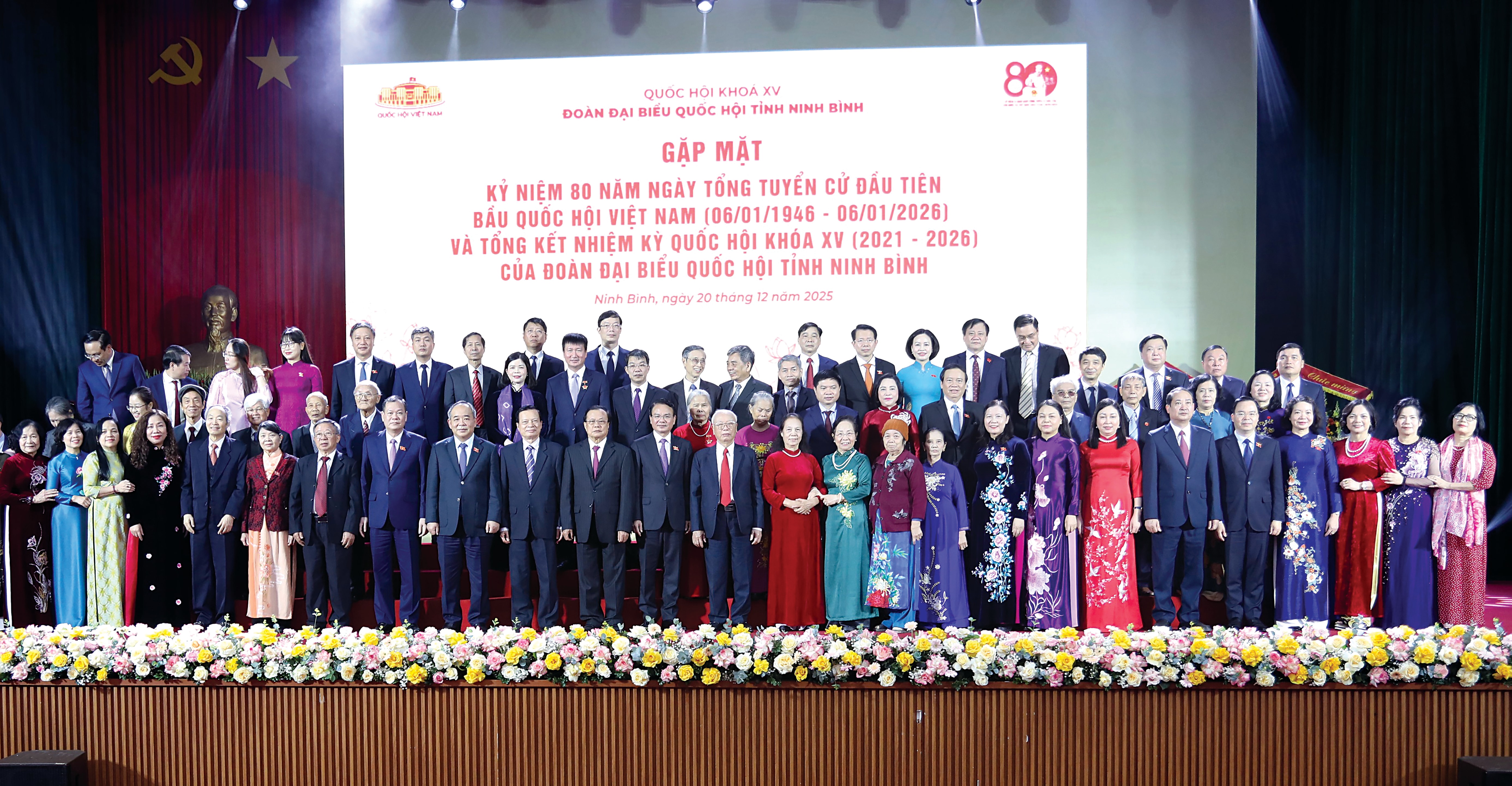 Các đại biểu chụp ảnh lưu niệm tại cuộc Gặp mặt kỷ niệm 80 năm Ngày Tổng tuyển cử đầu tiên bầu Quốc hội Việt Nam và tổng kết nhiệm kỳ Khóa XV của Đoàn ĐBQH tỉnh Ninh Bình. Ảnh: Trọng Hiếu