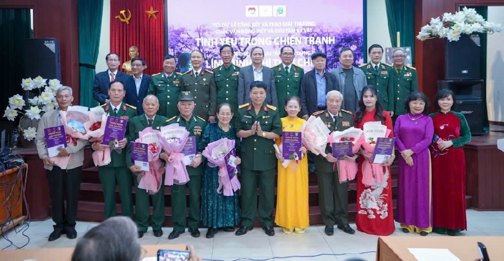 Tác giả Đặng Sỹ Ngọc (hàng đầu tiên, thứ tư từ trái sang) được vinh danh tại Cuộc vận động viết và sưu tầm kỷ vật “Tình yêu trong chiến tranh” do câu lạc bộ “Trái tim Người lính” phối hợp với Bảo tàng Phụ nữ Việt Nam, Quỹ “Mãi mãi tuổi 20” tổ chức.