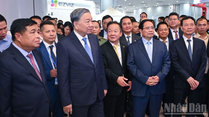 Tổng Bí thư Tô Lâm, Thủ tướng Phạm Minh Chính cùng các lãnh đạo các bộ, ngành tham quan gian trưng bày của T&T Group. (Ảnh: SƠN BÁCH)