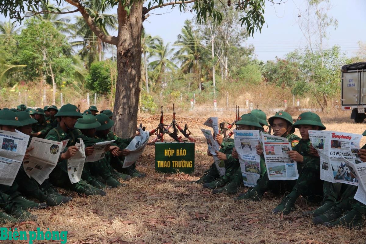 Cán bộ, chiến sĩ Tiểu đoàn Huấn luyện - Cơ động, Bộ đội Biên phòng tỉnh An Giang tiếp nhận thông tin qua các ấn phẩm báo chí. Ảnh: Tuấn Kiệt