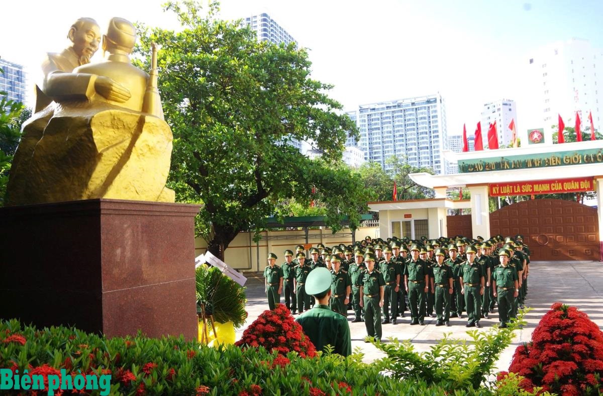 Cán bộ, chiến sĩ Bộ đội Biên phòng tỉnh Khánh Hòa dâng hoa, dâng hương tại tượng đài “Bác Hồ với chiến sĩ Biên phòng” nhân dịp kỷ niệm 50 năm Ngày Giải phóng miền Nam, thống nhất đất nước (30/4/1975 - 30/4/2025). Ảnh: Đơn vị cung cấp