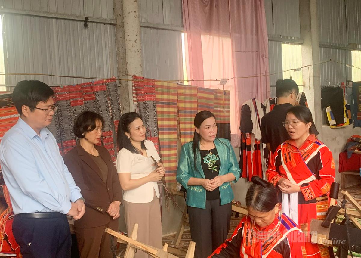 Đồng chí Chu Thị Ngọc Diệp, Chủ tịch Hội Nông dân tỉnh tham quan mô hình dệt thổ cẩm của nông dân xã Tân Trịnh.