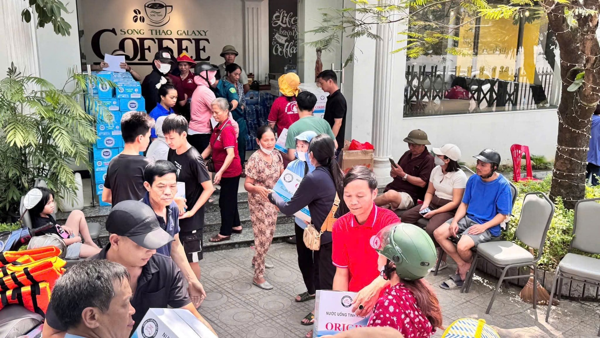 Người dân tập trung nhận hàng cứu trợ sau khi bão số 11 gây mưa lớn, ngập lụt nghiêm trọng trên địa bàn.