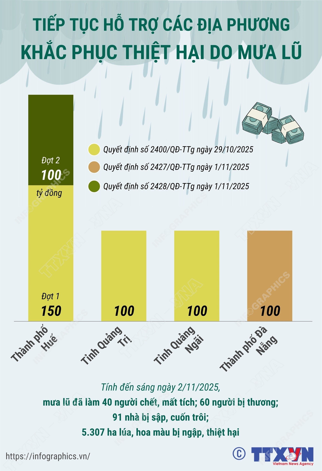 Trước đó, Thủ tướng Chính phủ cũng đã ký Quyết định số 2400/QĐ-TTg ngày 29/10/2025 hỗ trợ 350 tỷ đồng cho 3 địa phương: thành phố Huế 150 tỷ đồng, tỉnh Quảng Trị 100 tỷ đồng và tỉnh Quảng Ngãi 100 tỷ đồng.