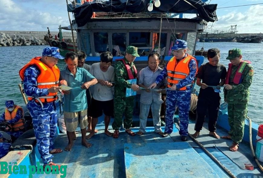 BĐBP thành phố Hải Phòng phối hợp với lực lượng Cảnh sát biển thực hiện công tác tuyên truyền, phổ biến, giáo dục pháp luật cho ngư dân trên biển. Ảnh: Cẩm Linh