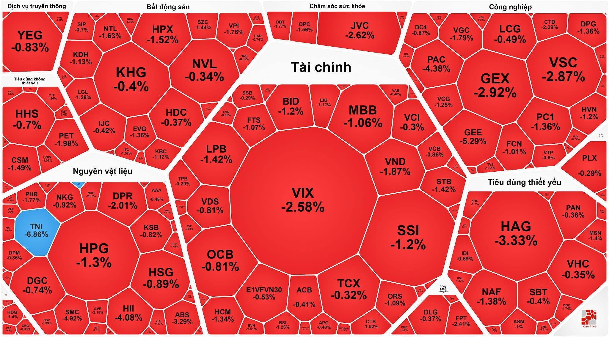 Nhóm cổ phiếu chứng khoán chìm trong sắc đỏ: VIX giảm 2,58%, SSI giảm 1,2%, VND và SHS giảm 1,87%, HCM giảm 1,34%, MBS giảm 1,42%...