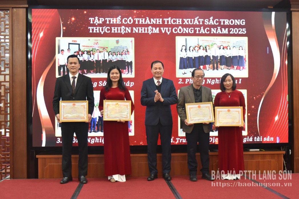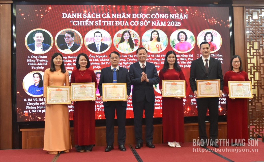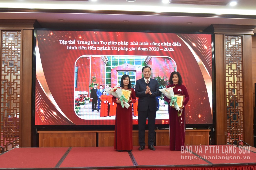 Nhân dịp này, Sở Tư pháp được nhận Bằng khen của Bộ trưởng Bộ Tư pháp vì có thành tích xuất sắc trong công tác xây dựng và thi hành pháp luật giai đoạn 2024 - 2025; 1 tập thể, 1 cá nhân được Bộ trưởng Bộ Tư pháp công nhận điển hình tiên tiến ngành tư pháp giai đoạn 2020 - 2025; nhiều tập thể, cá nhân được nhận giấy khen của Giám đốc Sở Tư pháp vì đã có thành tích xuất sắc trong thực hiện nhiệm vụ công tác, 13 cá nhân được tặng danh hiệu “Chiến sĩ thi đua cơ sở” năm 2025.
