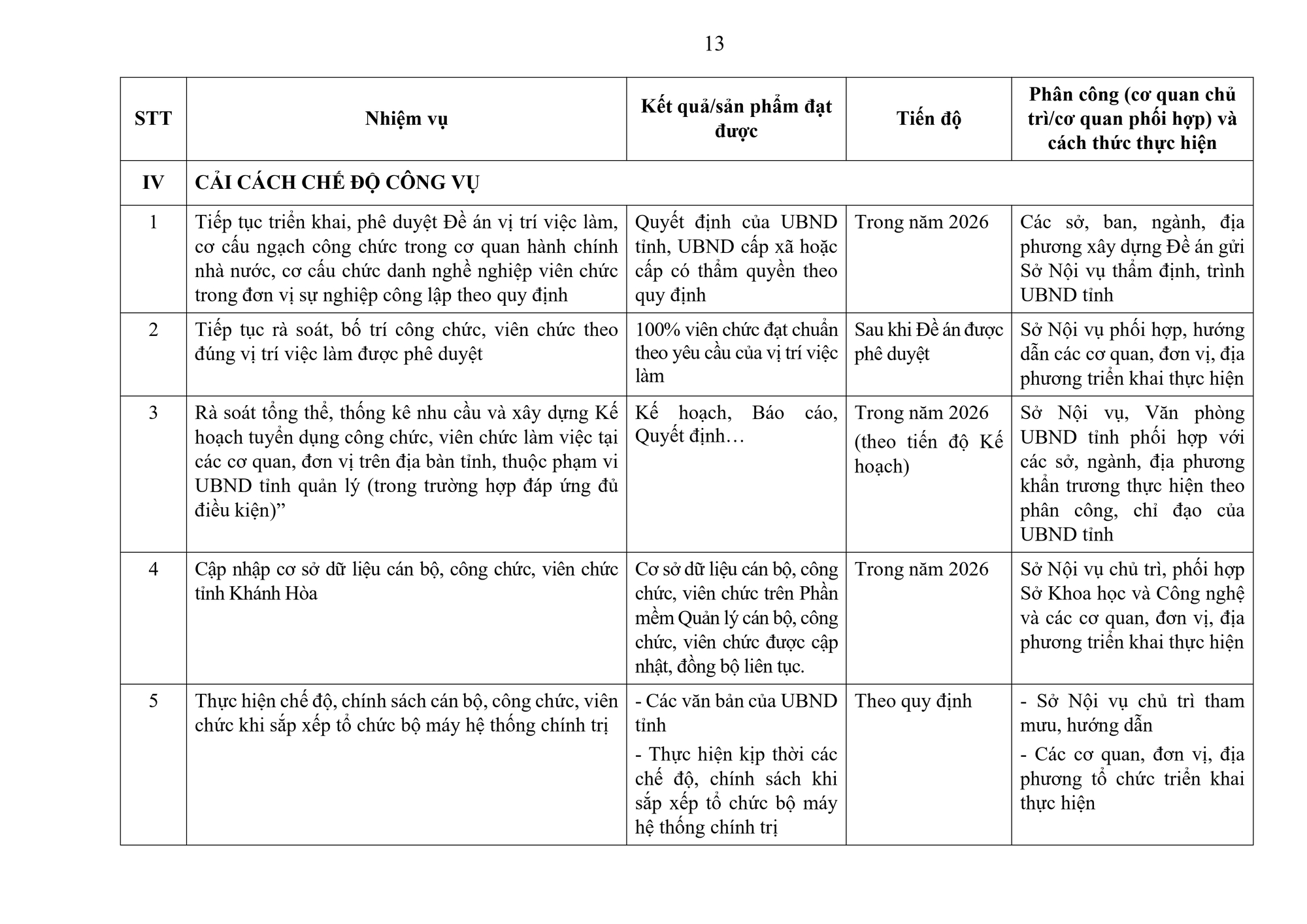 UBND tỉnh Khánh Hòa ban hành Kế hoạch số 1277/QĐ-UBND về bổ sung, cập nhật Kế hoạch cải cách hành chính năm 2026, trong đó giao nhiệm vụ tiếp tục rà soát, sắp xếp đơn vị sự nghiệp; sắp xếp người hoạt động không chuyên trách; rà soát các thôn, tổ dân phố; triển khai chính sách tinh giản biên chế...