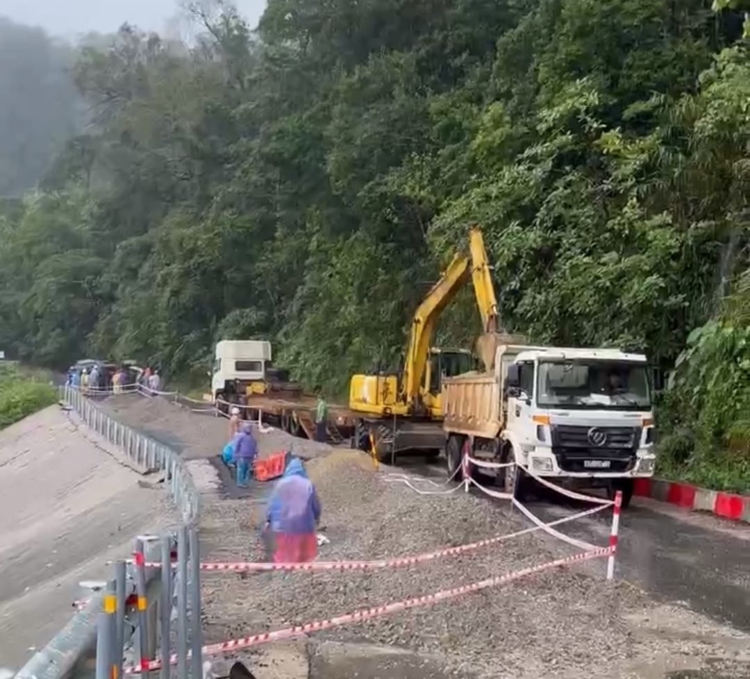 Cũng trên tuyến, tại Km76+900, nền đường xuất hiện vết nứt và bị sụt lún mạnh do sạt lở. Đơn vị quản lý tuyến đã triển khai máy móc và đổ đá để khắc phục tạm thời, đảm bảo lưu thông bước đầu cho các phương tiện.