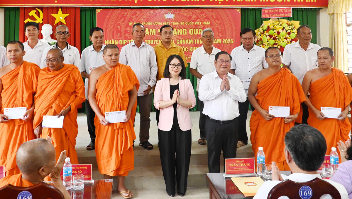 Tại đây, đoàn công tác đã trao 50 phần quà cho các vị chức sắc, chức việc, Achar và người có uy tín, ghi nhận đóng góp trong vận động đồng bào chấp hành chủ trương, chính sách, giữ gìn bản sắc văn hóa. Đồng thời, đoàn trao 100 suất quà cho các gia đình đồng bào Khmer nghèo, gia đình chính sách, góp phần giúp bà con đón Tết vui tươi, đầm ấm.