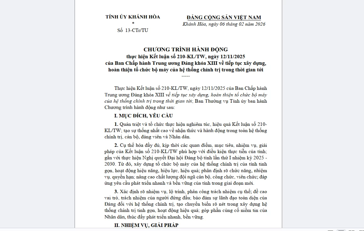 Ban Thường vụ Tỉnh ủy Khánh Hòa vừa ban hành Chương trình hành động thực hiện Kết luận số 210, ngày 12-11-2025 của Ban Chấp hành Trung ương Đảng khóa XIII về tiếp tục xây dựng, hoàn thiện tổ chức bộ máy của hệ thống chính trị trong thời gian tới.